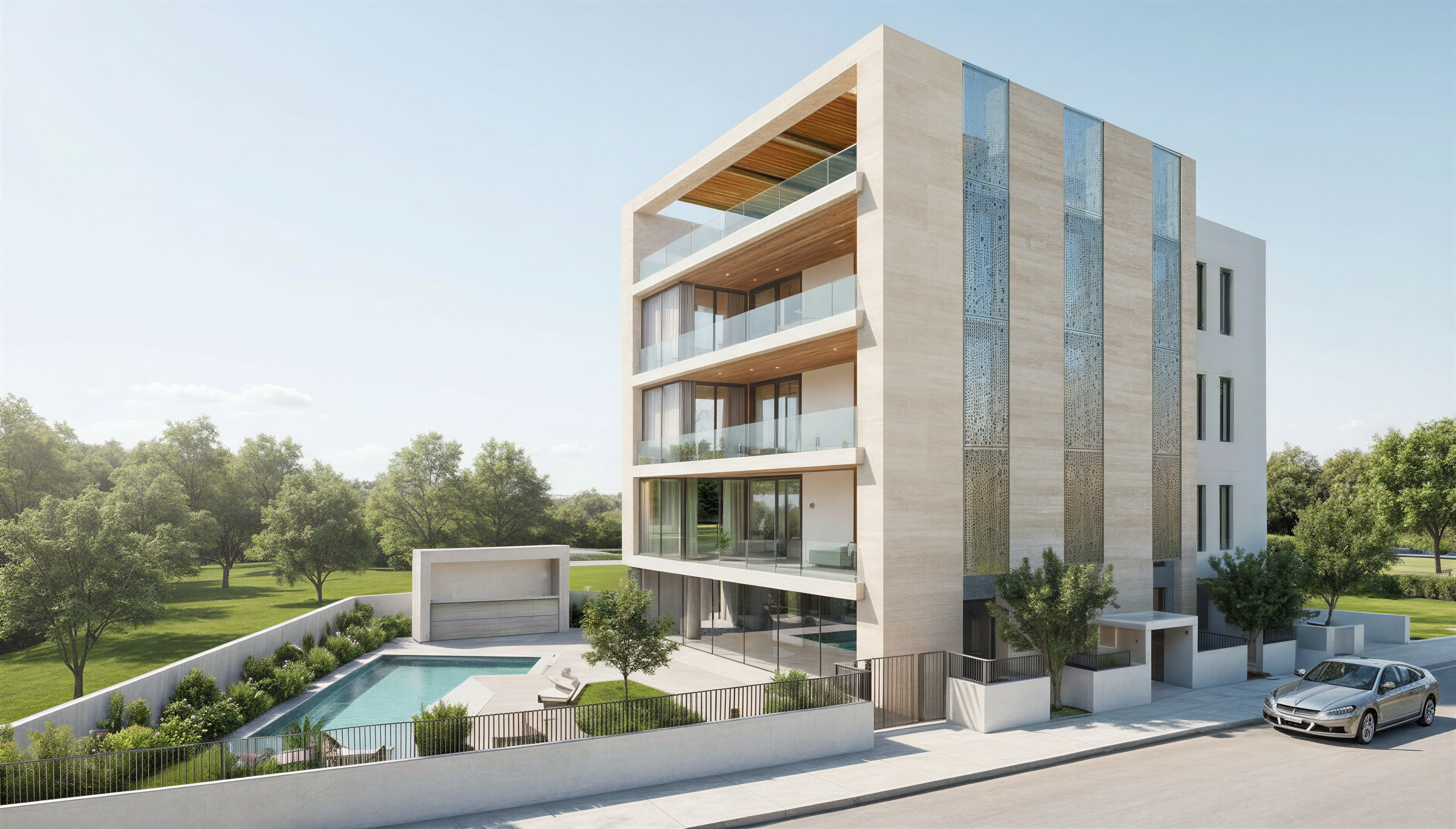 replace the existing car with a modern luxury bmw x5 white color 2025 match the scale perspective and lighting exactly enhance the entire image to ultra photorealistic quality high end architectural rendering realism v ray corona style perfect physically accurate lighting soft mediterranean daylight clean bright sky with gentle atmospheric haze smooth global illumination no hard shadows realistic reflections on all glass surfaces high resolution materials stone plaster wood metal and pavement sharpen fine details while keeping natural softness in lighting improve foliage realism crisp leaves soft shadows natural color improve pool water realism clear reflective turquoise physically accurate caustics keep all building geometry camera angle layout and proportions unchanged do not modify the architecture fa ade materials balconies fences or pool layout only replace the car and upgrade the entire scene to high end photoreal quality