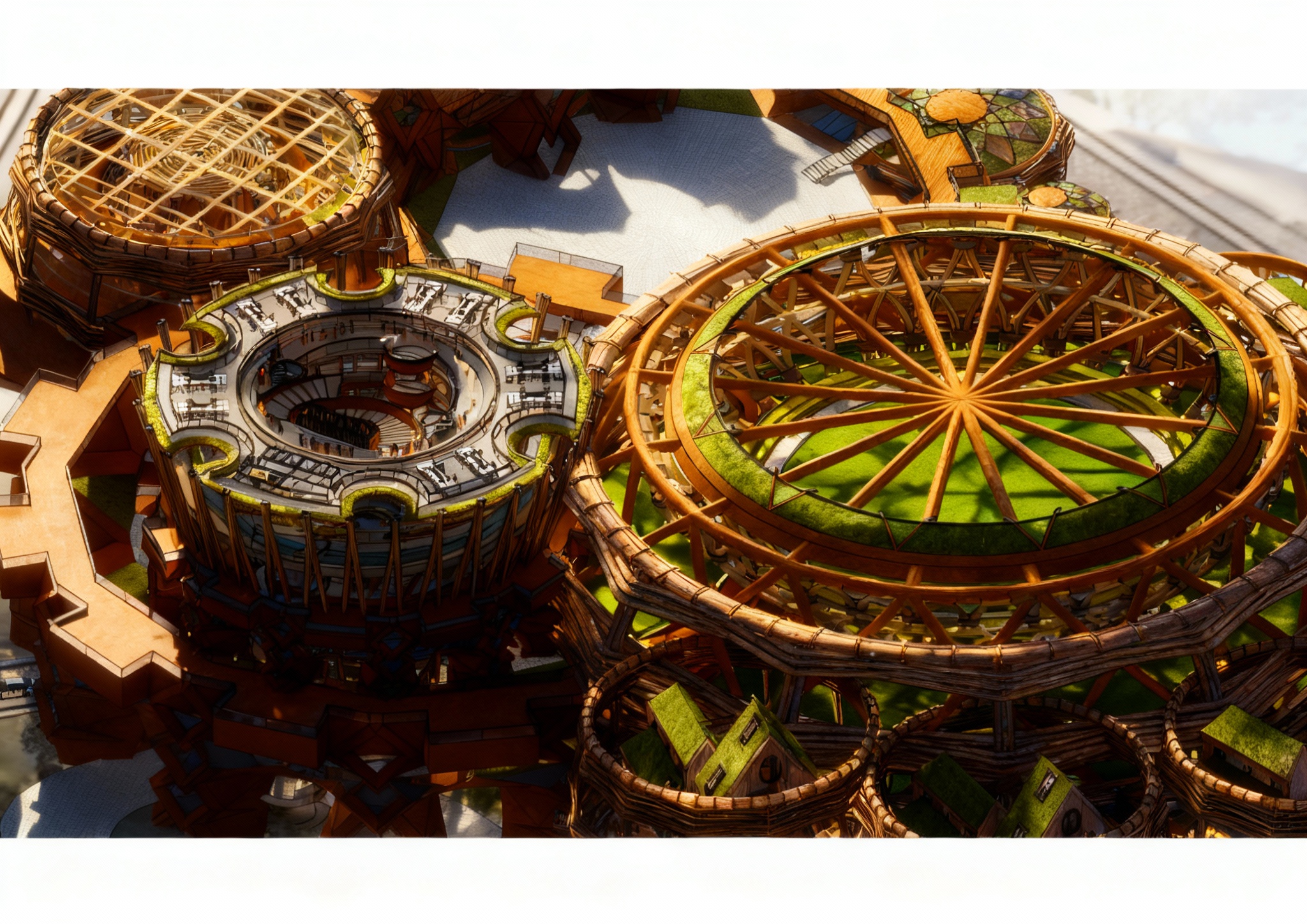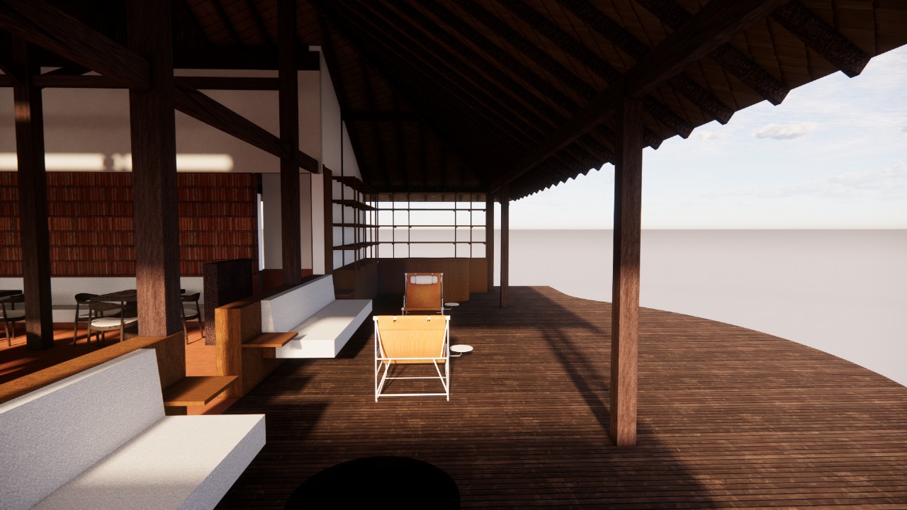 add tropical fern landscape behing the shelving seen through fluted glass the scenery outside is blue sky with forest the interior scene is brighter