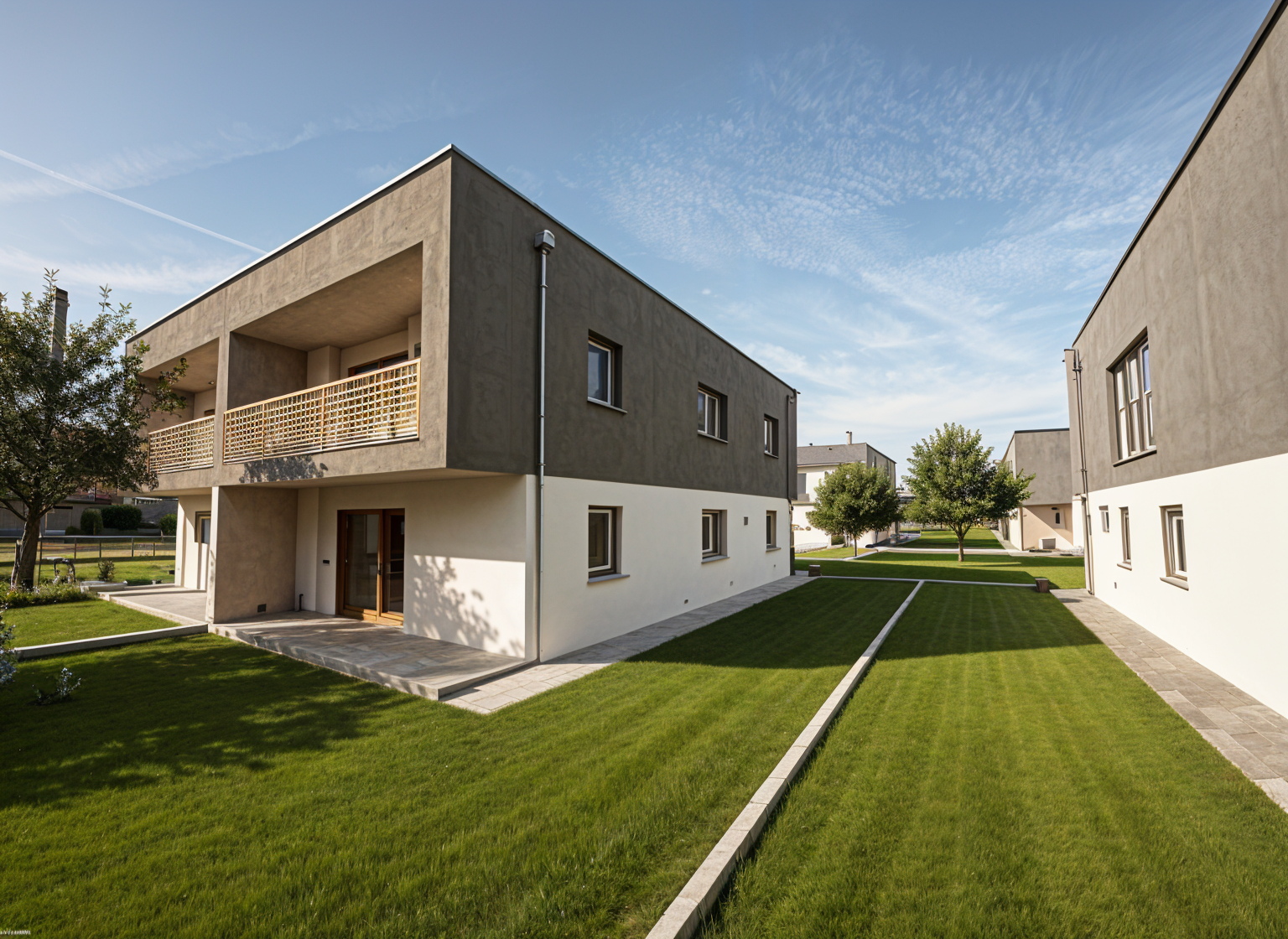 exterior shot add grass summer vibe add tree between houses replace red suface with the road upper grey facade should be uniformly colored gray architecture