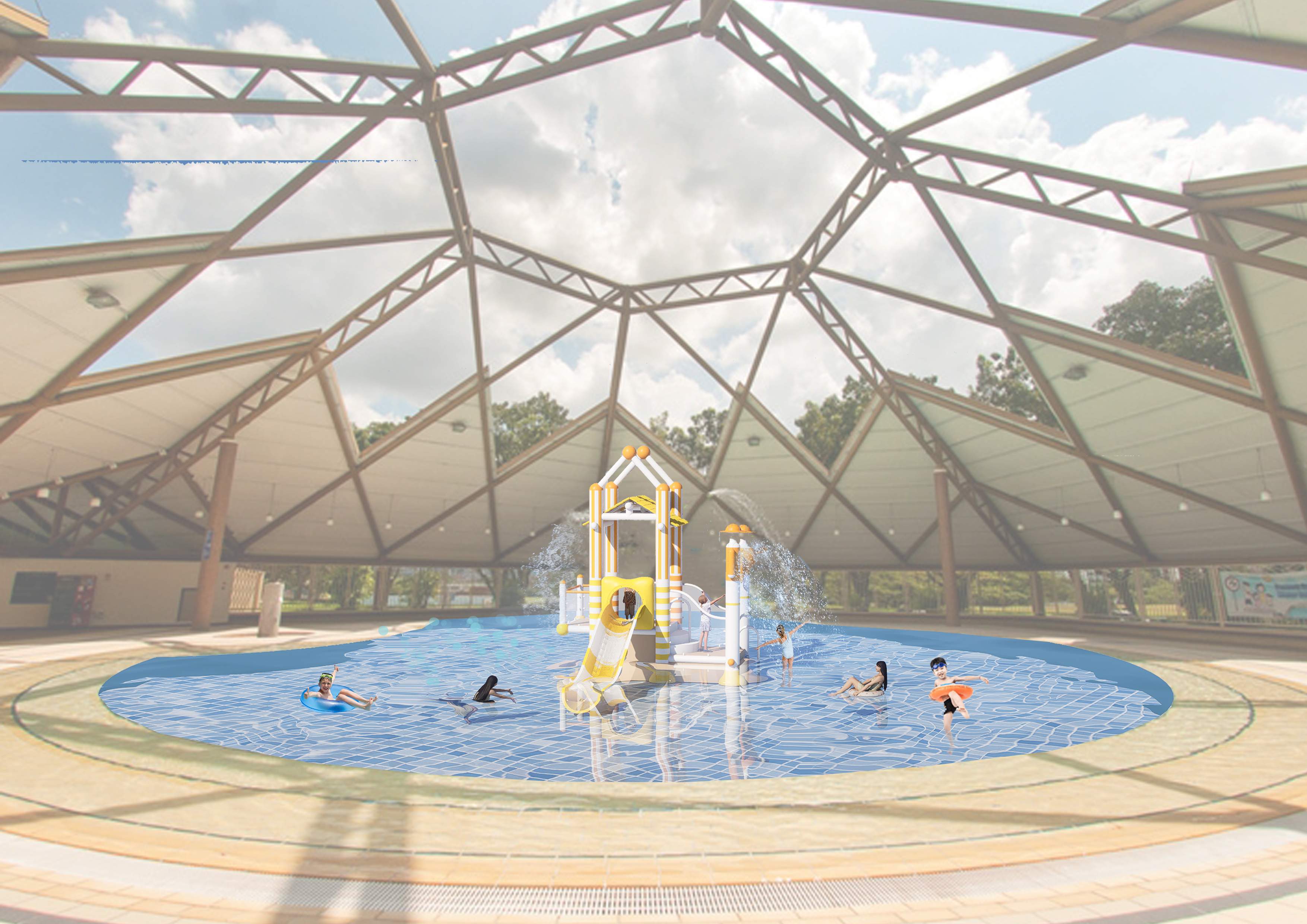 enhance render in high resolution with real water effect and water spray kids play in the water pool keep the pool tiles visible