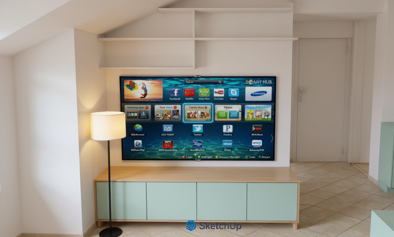 modern mediterranean style interior with light colors walls are white standing high floor lamp on the very left corner of the picture dresser can be in light wood decor or light blue