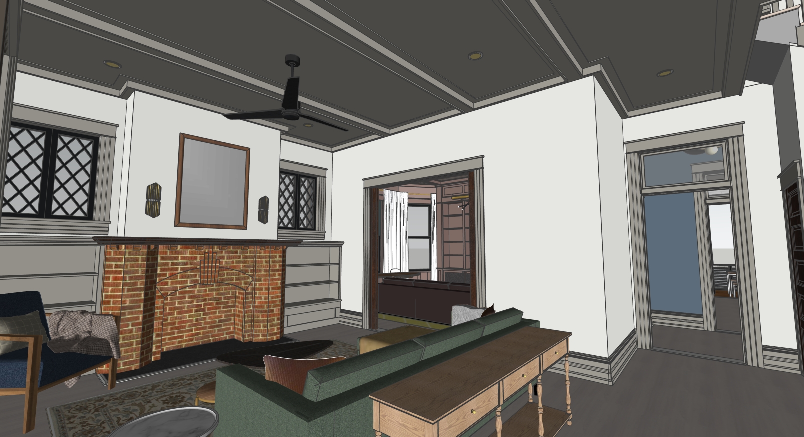 maintain geometry modern art on walls books on shelves lamps on console table