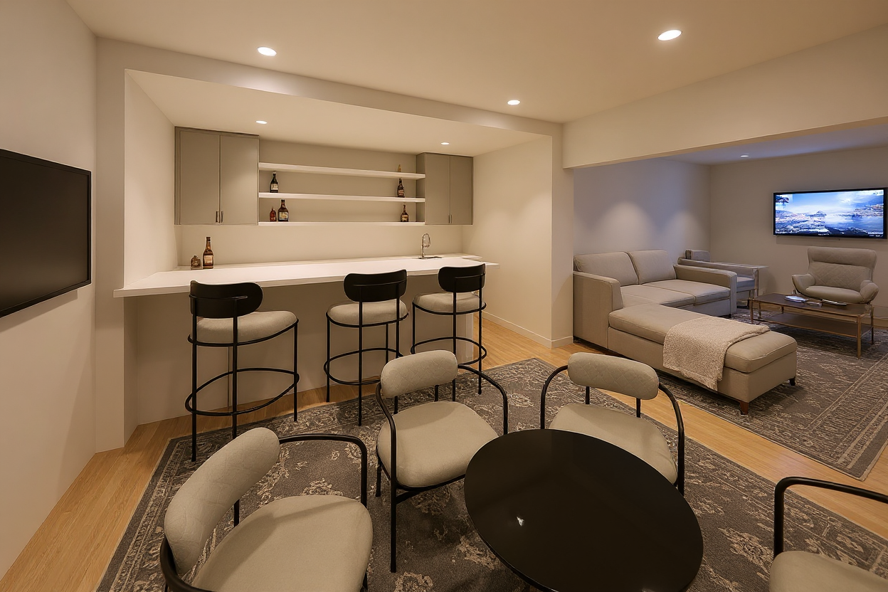 add oriental patterned grey area rug under couch add liquor bottles to shelves add a folded blanket to end of couch add books to coffee table add accessories to countertop by tv change remove area rug in dining area chairs by round table