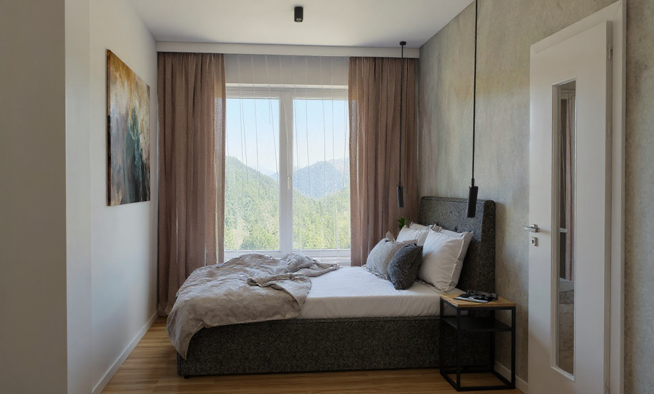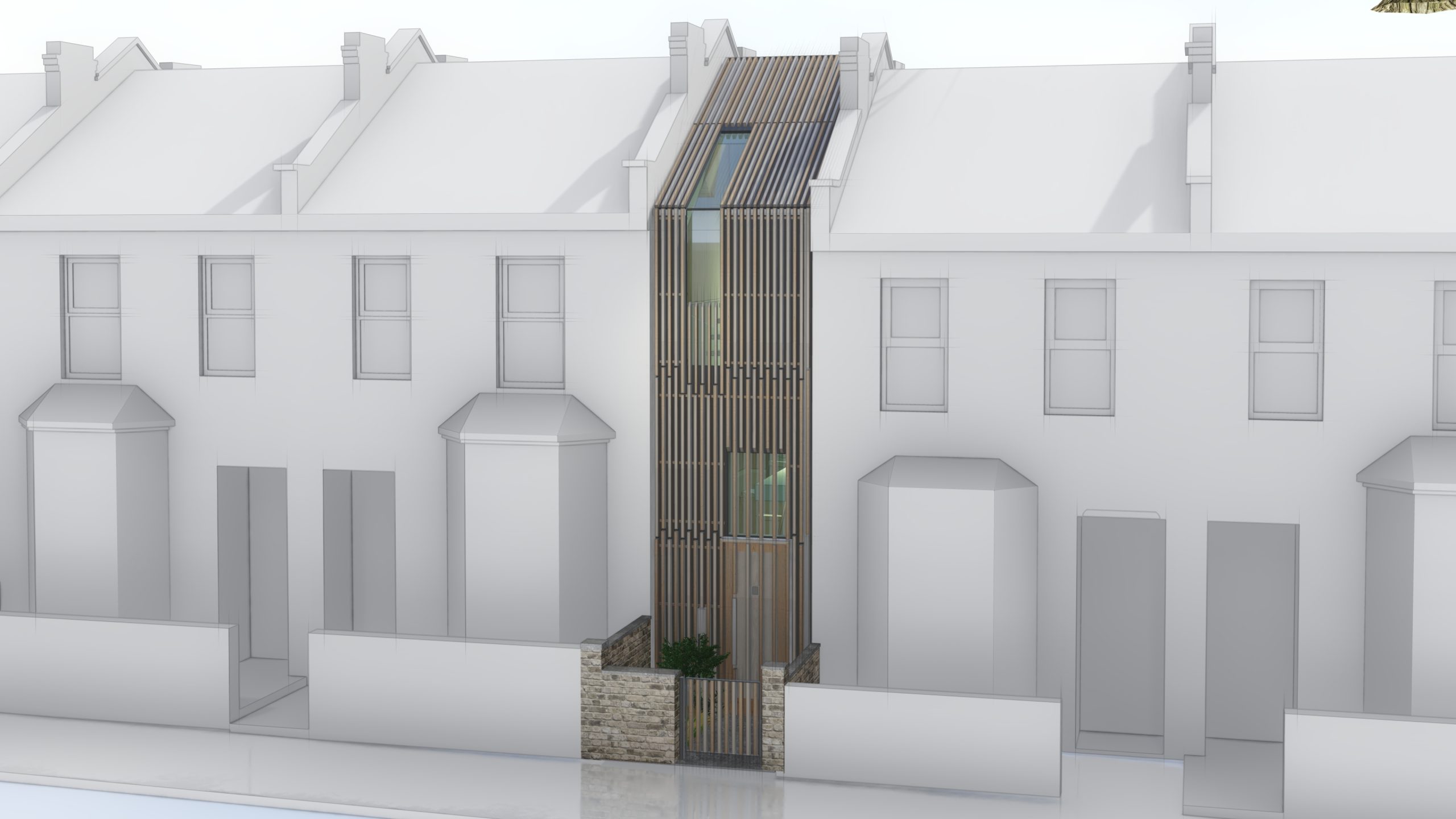 a blanket of fine snow lies across the large scale model of a thin house the image is incredibly realistic and hard to tell whether it is an actual building or a highly details model the lighting remains the same but the background sky is darker