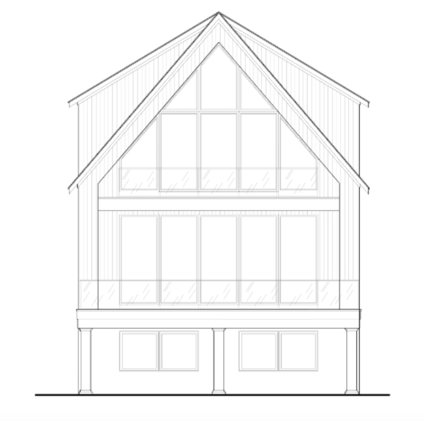 this elevation will face lake minocqua in wisconsin the house is on a wooded lot with a viewing corridor to the lake with a dock the house will be clad in vertical wood siding in a natural cedar color there is a 75 set back from the lake to the house show a deck on the first floor and a 4 cantilevered balcony on the 2nd floor there will be a couch and outdoor furniture on the deck show a patio at grade with a grass lawn the topography of the site drops towards to water with steps down to the dock