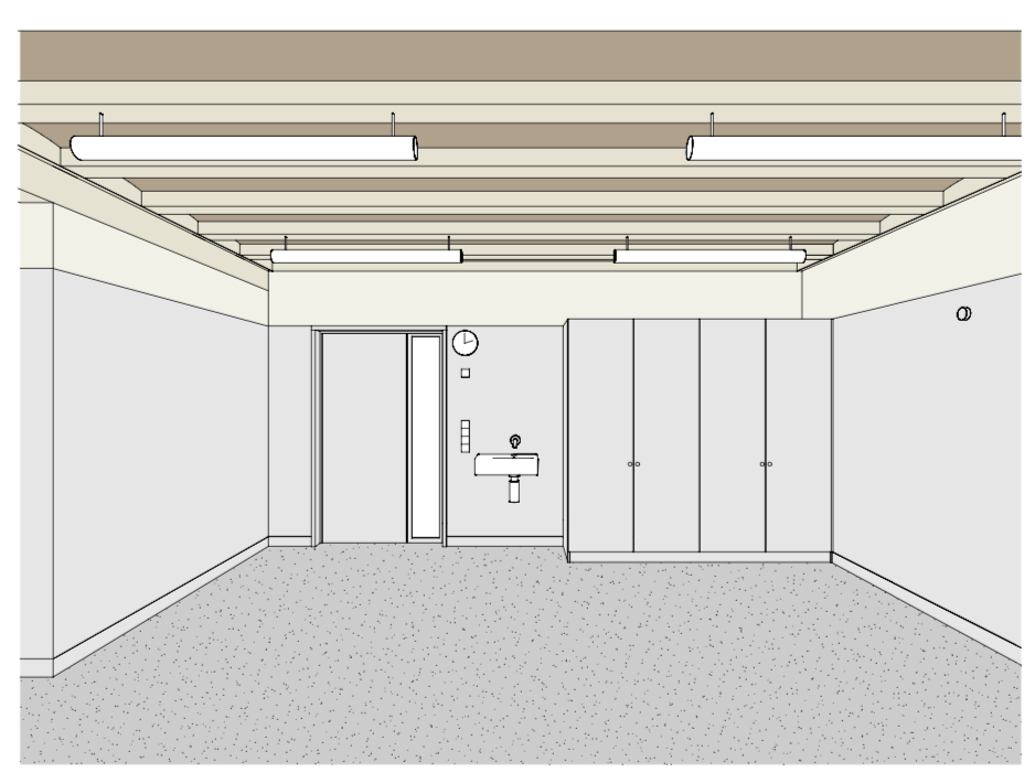 interior shot the slab is from lime and the structure of beams and columns is wood the floor is linleum grey the walls are painted white and grey the wardrobe is also grey it is a interior of a school