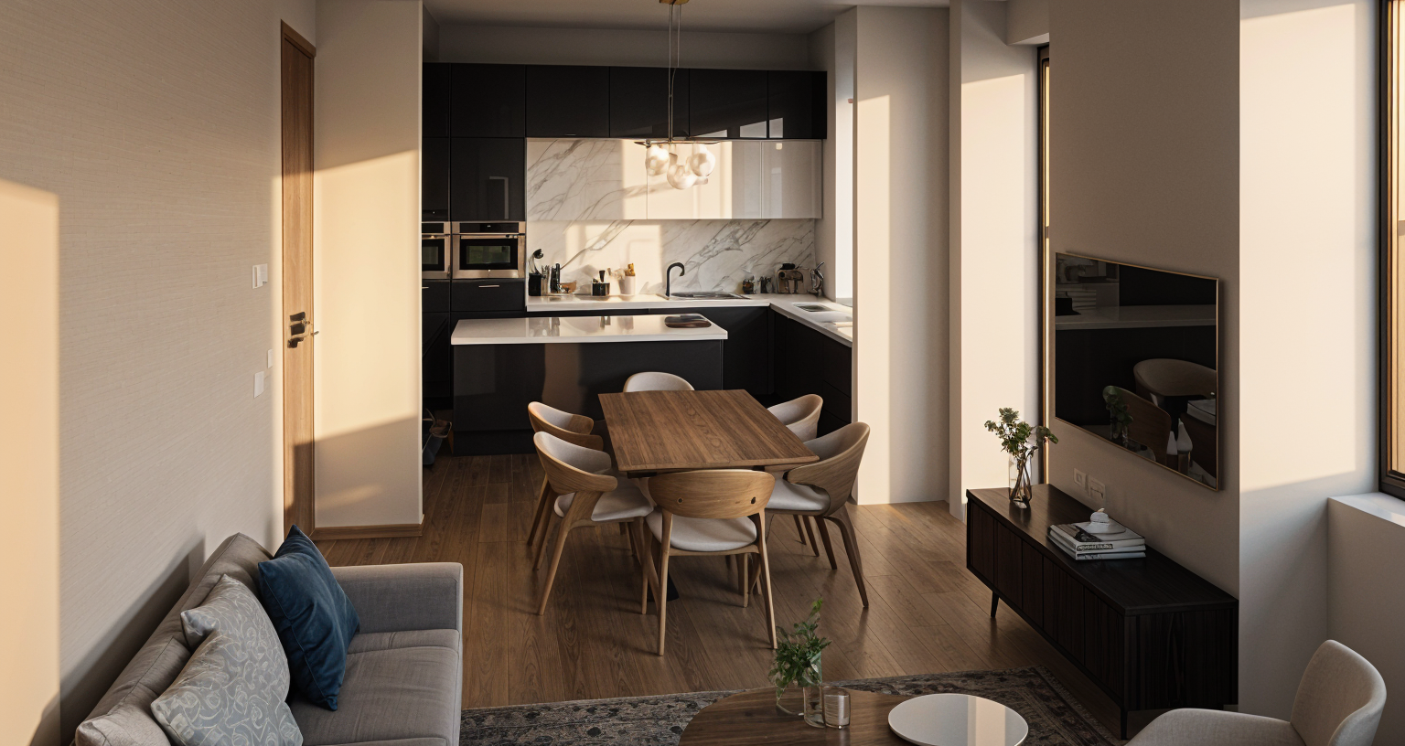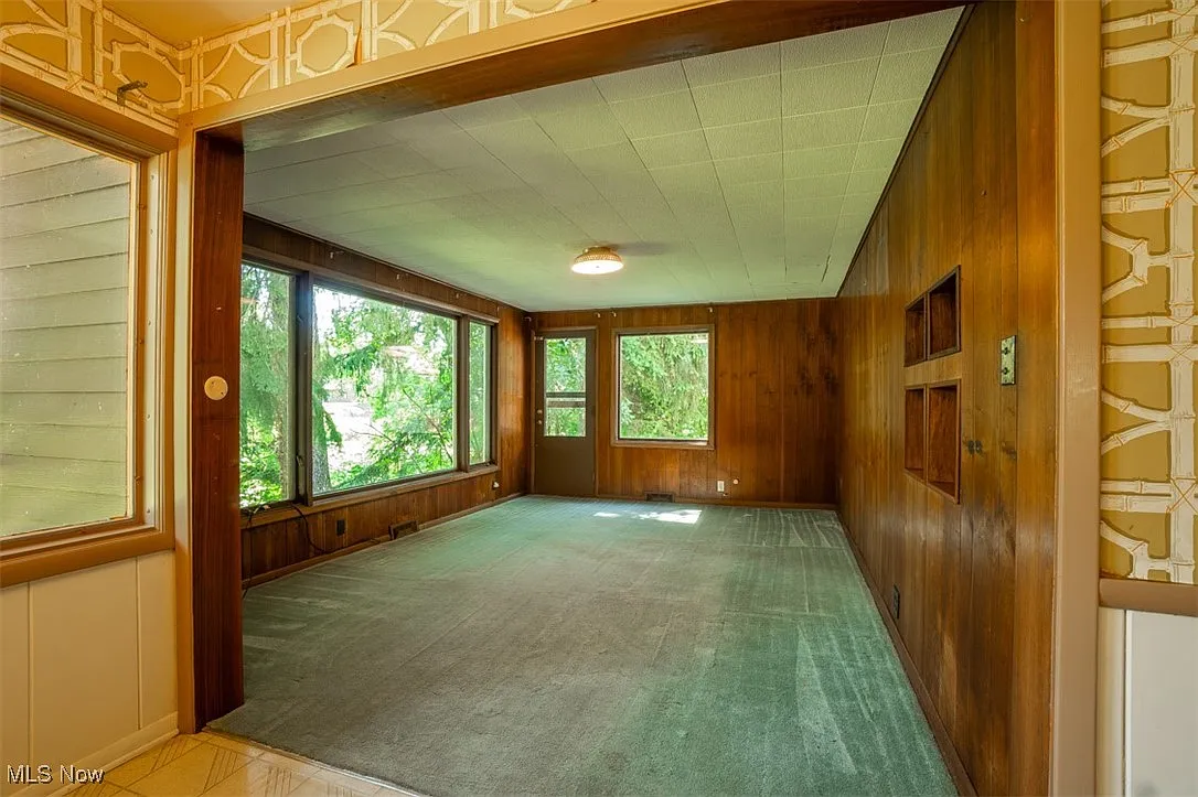 modernist interior shot i want to take this room and show it renovated into a new mid century style lounge den i want to remove the door in the background and fill it in with solid wall to match the rest floors should be very dark rift sawn oak with a throw rug we should have a sofa and two accent chairs facing one another we need to update the wall panels to something a bit more luxurious clean up the ceiling with a warm paint color and new warm glowy light fixtures let s also put some nice curtains floor to ceiling on the long wall to the left that allow the sun to creep through keep this image warm moody comfortable and in that contemporary yet midcentury vibe architecture