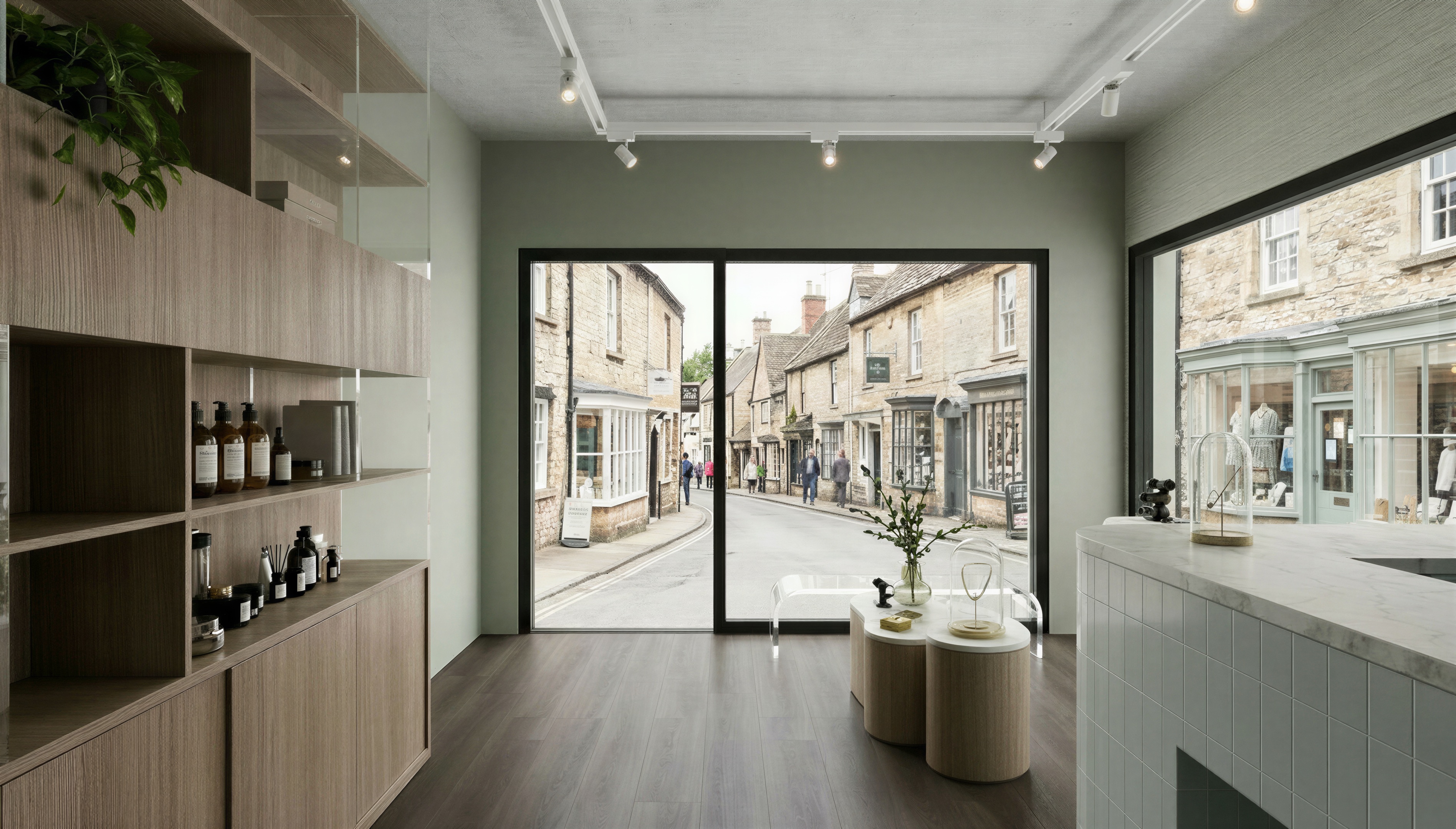 photorealistic interior architectural visualization of a high end hair salon make it so that the glass door opens inward to the left and there is an extra frame beam missing at the front soft natural daylight high end boutique atmosphere 8k resolution cinematic lighting