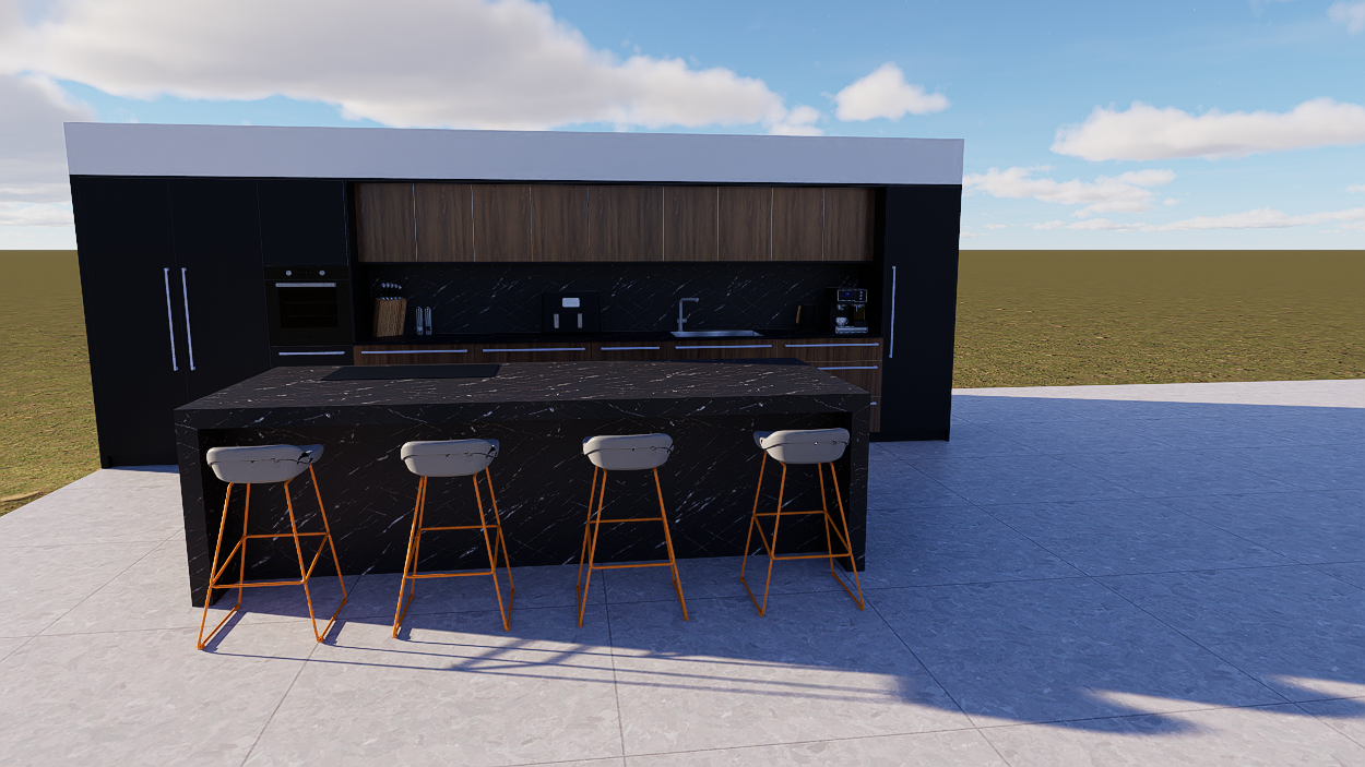 enhance the realism of this 3d kitchen scene using physically accurate lighting and shadows only do not modify geometry materials colors or textures use natural daylight illumination with a realistic sky contribution including soft global illumination and subtle ambient bounce light simulate a slightly warm sunlight coming from one side low to mid angle to create depth and contrast add soft but defined contact shadows under cabinets handles and edges to ground objects improve ambient occlusion in corners and between surfaces for more depth introduce subtle reflections and light falloff on glossy and semi gloss surfaces especially the black panels and backsplash without altering their material properties ensure realistic exposure balanced contrast and gentle highlights no overexposure slight hdri style lighting is recommended shadows should be soft edged but physically consistent with the light direction avoid harsh artificial lighting keep it natural and cinematic goal photorealistic rendering through lighting only preserving the exact original design and textures