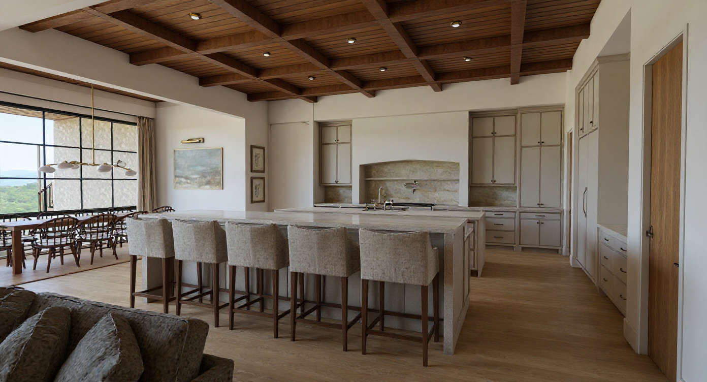create a hyper realistic render of a modern luxury house built on the edge of a cliff featuring an infinity pool that merges seamlessly with the ocean horizon match the exact camera angle framing and proportions from the reference image it is sunset with warm golden hour lighting long soft shadows and an amber glow across the scene the sun should be visible low over the ocean at the far end of the horizon casting warm reflections across the surface of the infinity pool preserve the architectural elements large glass sliding doors sleek black window frames the wooden soffit with recessed lighting minimalist terrace flooring sun loungers marble side tables and the wooden deck chair in the background add natural coastal vegetation on the left side growing from the cliff edge render the pool water with realistic reflections subtle waves and depth the overall atmosphere should feel serene elegant coastal and cinematic emphasizing high end materials and the striking golden hour light over the ocean