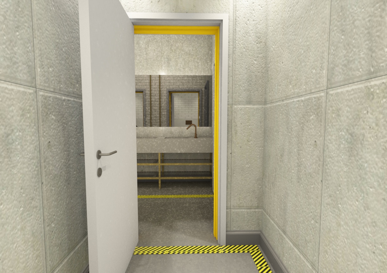 ultra realistic architectural interior render of an industrial style public bathroom raw exposed concrete walls and structural surfaces with subtle imperfections and formwork texture style contemporary industrial architecture brutalist influences high realism materials rough concrete gray painted brick powder coated metal concrete sink safety yellow industrial paint lighting realistic global illumination soft indirect lighting from mirror backlights neon ceiling lights casting subtle reflections on concrete floor mood clean but raw industrial public restroom slightly cinematic architectural visualization quality camera eye level architectural shot 24 28mm lens deep focus photorealistic rendering subtle ambient occlusion high dynamic range lighting important constraints preserve the industrial architecture style avoid adding extra elements or altering the layout