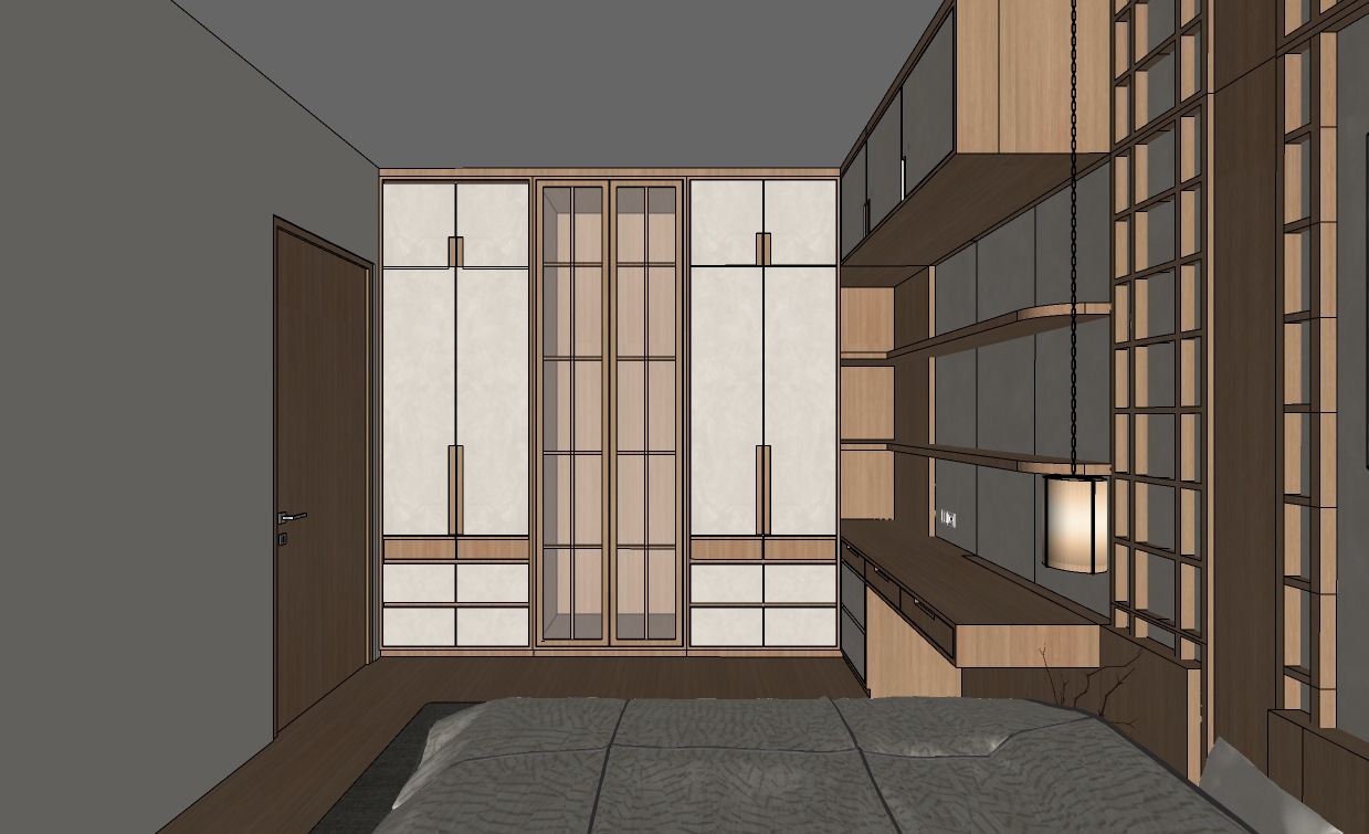 create an ultra realistic image from this jpg add ceiling spot lights use soft light wood textured to the floor and use warm off white for walls and the ceiling is white and add indirect light to the shelves add some decoration and add indirect light to the wood ceiling panel add soft outdoor light the wardrobe door using cream color