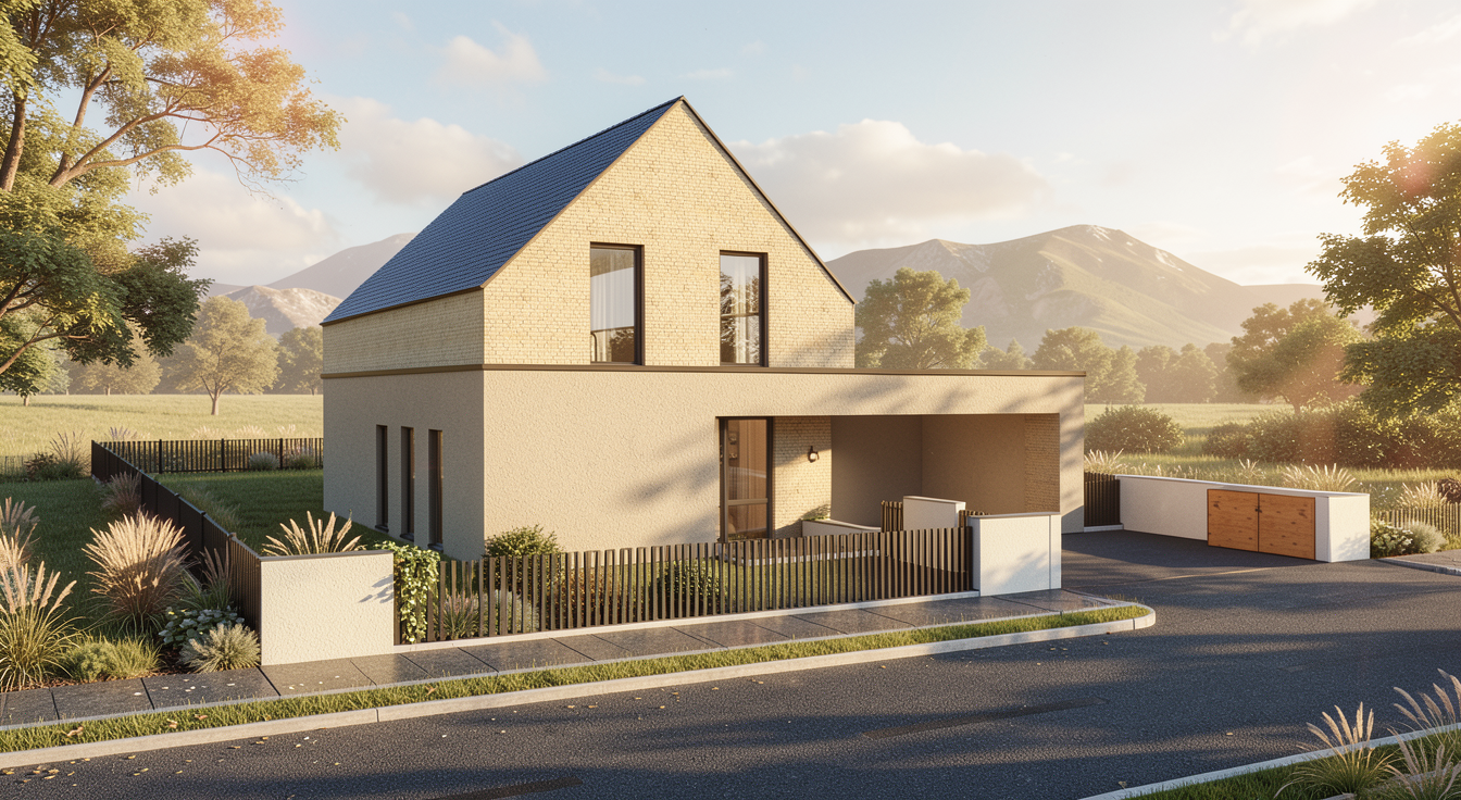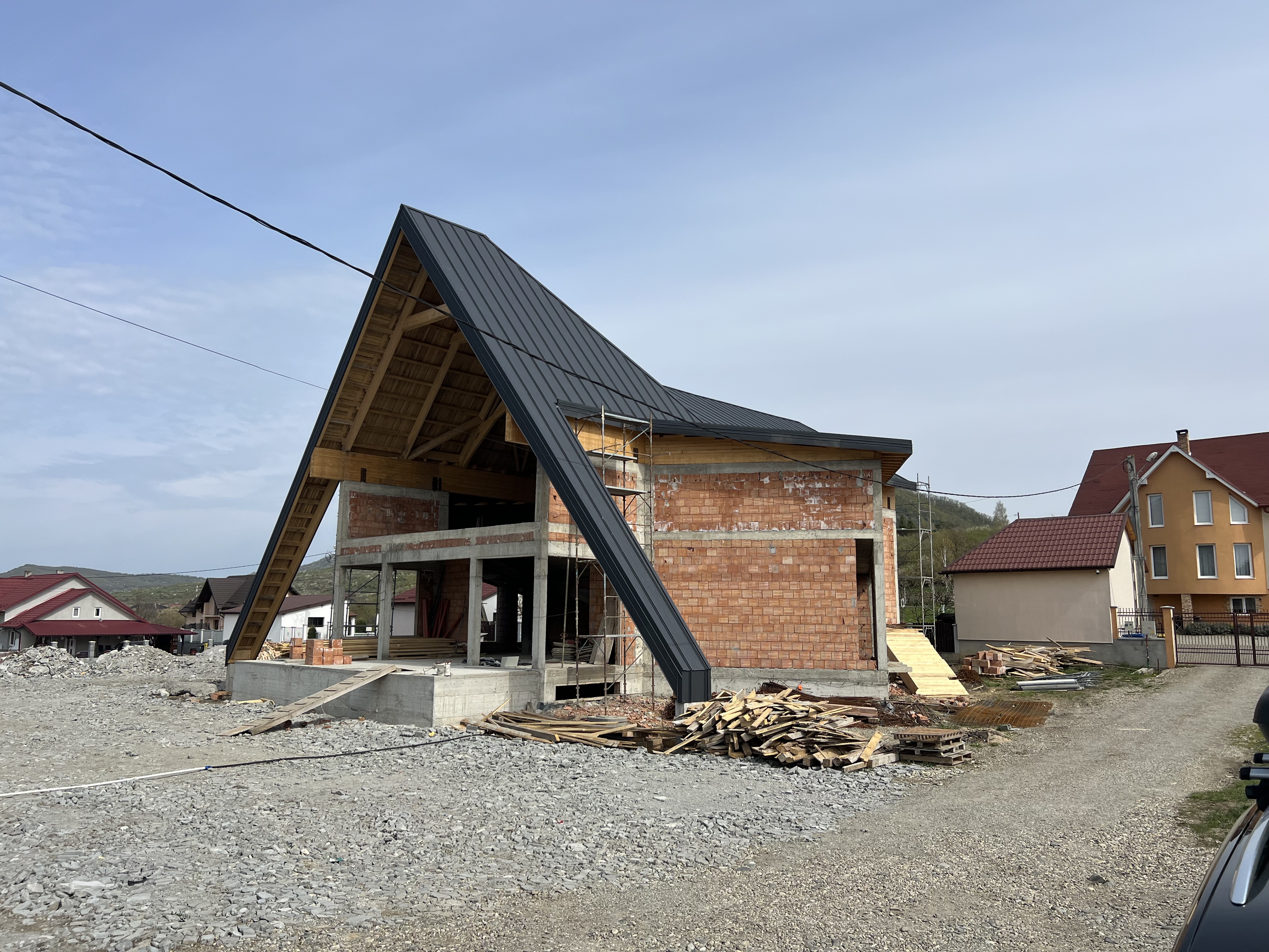 photorealistic facade enhancement of the existing building in the uploaded photo keep the original architecture exactly unchanged do not modify the building shape roof geometry a frame proportions structural frame side walls openings positions massing or camera angle preserve the exact construction and all existing architectural lines strict instructions for the front a frame facade in the main front a frame opening add curtain wall glazing only in the lower portion from the ground level main facade opening up to the horizontal wooden beam ends the visible timber beam tips that project inside the a frame from that beam line upward to the top apex of the a frame do not use glass this upper triangular zone must become a solid opaque wall clean and modern aligned with the a frame geometry the lower glazed area should be a refined modern curtain wall system with slim dark anthracite aluminum frames keep the exact a frame outline and all roof lines unchanged strict side wall instructions do not add or simulate any new windows on the lateral walls do not create glazing on the side brick facades keep side walls mostly solid only respecting existing architecture no fake windows no extra openings facade material instructions change the visible exterior wall finishes to a refined warm white light beige soft greige palette keep the look contemporary elegant minimal and realistic premium but believable architectural finish site landscaping instructions create a clean modern front landscape design add one main access walkway leading to the entrance add curved rounded lawn areas soft organic grass islands not rigid geometric beds use smooth rounded green zones with ornamental grasses low shrubs and a few soft planting masses keep the landscape elegant natural and minimal add subtle realistic paving and clean site organization remove construction debris visually and present a finished completed site important constraints no architecture redesign no shape changes no roof changes no structural changes no new windows on the side facades no glass in the upper triangular part of the a frame above the timber beam line only lower a frame curtain wall glazing solid upper wall facade finish site landscaping photorealistic architectural visualization realistic daylight premium modern finish clean completed project look