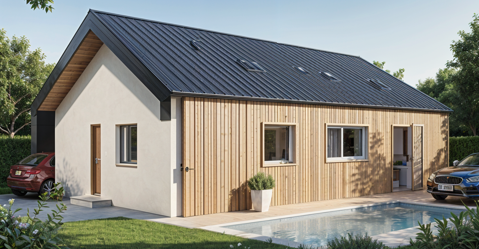render a photorealistic 3d perspective of this house in a hungary do not change the view keep model geometry the same windows doors roof walls pavement driveway fences facade decor sidewalk hyper realistic 8k cinematic lighting serene atmosphere photorealistic textures realistic reflections reference the current material style just enhance them only enhance the current materials and make the landscape nicer vegetation detailed textures in the wood siding and glass reflections and a vibrant clear sky with light atmospheric depth render in hyper realistic architectural visualization quality 8k resolution roof minimalist anthracite concrete tile facade a mix of smooth white mineral plaster horizontal walnut wood slats windows antracit aluminium minimal fence anthracite colored premium metal mesh landscape professional minimalist garden design green clean cut grass 2 young maple tree prunus laurocerasus whether nice clear early summer in middle europe outside the fence some new family houses natural hungarian great plain native landscape do not add any elements de not change the composition