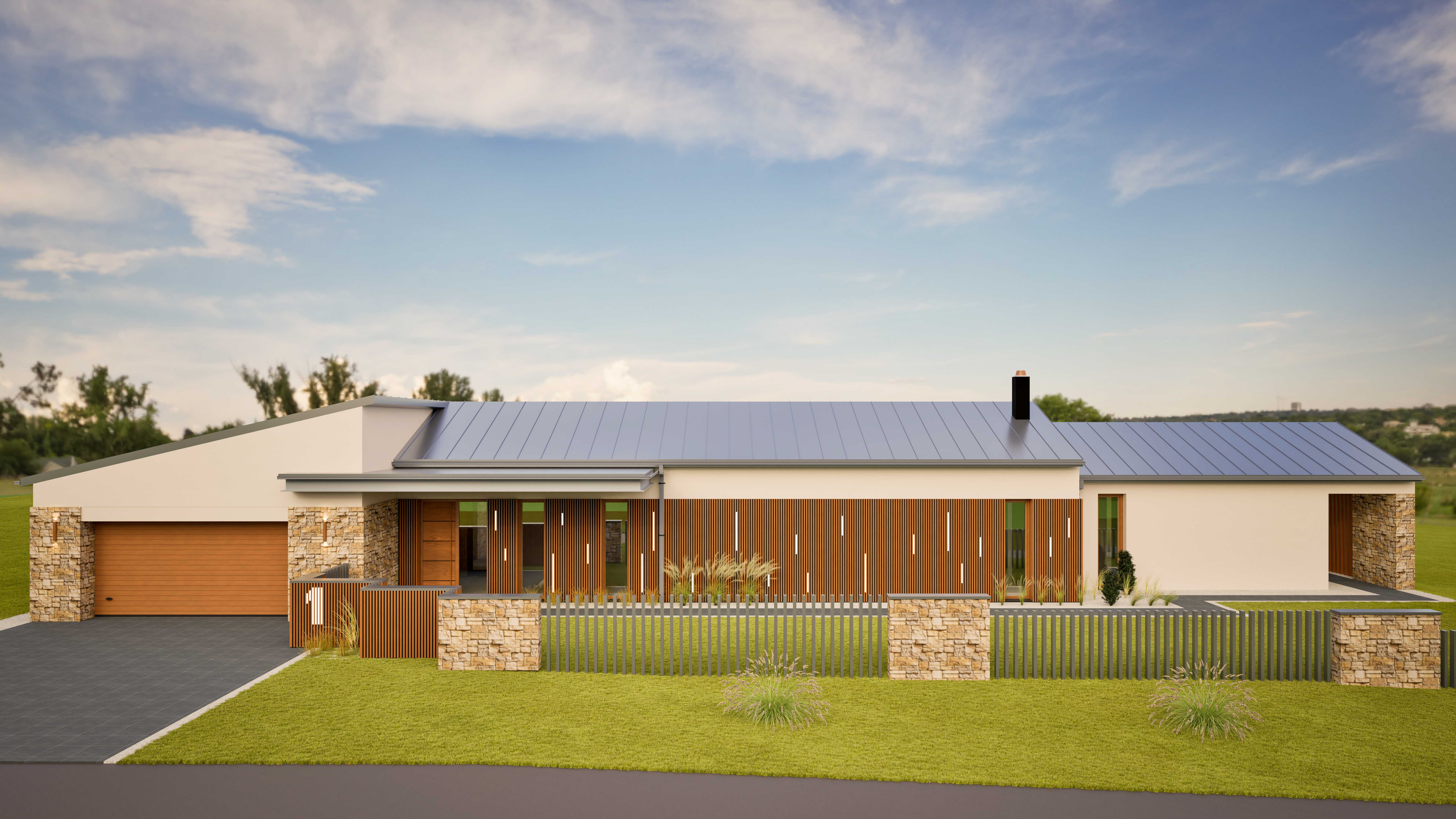 arrange a photorealistic 3d perspective of this house refer to the current material style just enhance them preserve model geometry windows doors roofs garage door sidewalk driveway sparse vegetation in front of the fence ornamental grass from species lavender don t change the view don t change anything about the house the overall atmosphere is calm and modern evoking a sense of peace and elegance the shadows are realistic the asphalt road should have a realistic surface the plants should have detailed textures render it in hyper realistic architectural visualization quality