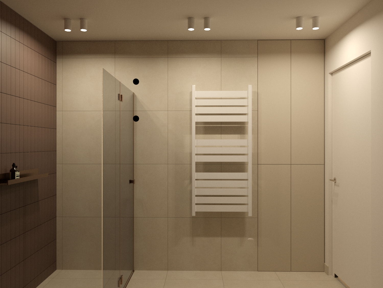 usun czarne kropki i popraw jakosc wizualizacji ultra photorealistic modern minimalist bathroom interior warm neutral color palette large matte beige wall tiles with thin grout lines walk in shower with frameless glass panel and black round hinges subtle reflections on glass white wall mounted towel radiator vertical wood slat accent wall in warm walnut tone on the left floating shelf with small dark bottles recessed ceiling spotlights 3000k warm light soft indirect lighting light beige floor tiles flush white door on the right with minimal handle realistic tile texture with slight roughness variation micro shadows between tiles subtle imperfections soft global illumination natural light mixed with warm artificial lighting interior photography 35mm lens eye level camera height 120cm shallow depth of field realistic exposure soft shadows high detail textures 8k no people