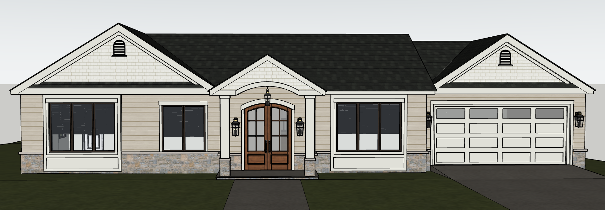 make this image look like a real image add in landscaping and real lighting keep the windows free of grid lines
