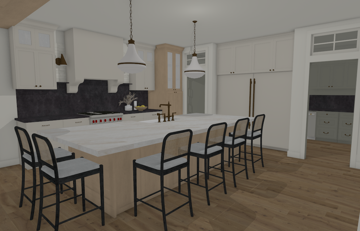 keep all materials and colors the same transform this architectural interior design drawing into a photorealistic rendering maintain the exact layout dimensions and placement of all elements do not change materials colors or geometry additionally apply a very subtle hand drawn architectural sketch overlay faint pencil line edges around furniture silhouettes cabinetry and key architectural elements as if barely sketched over the photograph keep it extremely subtle the photorealistic image must remain fully dominant
