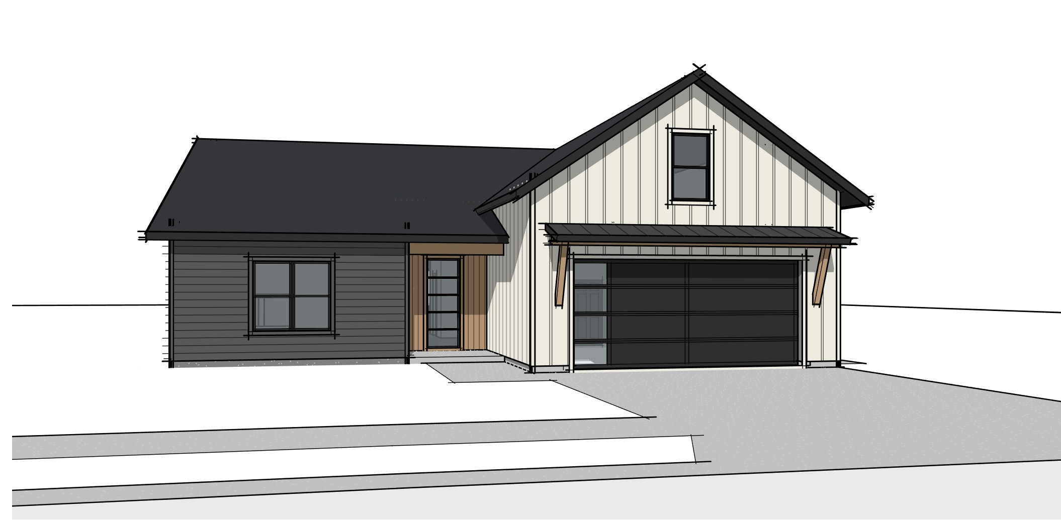 render a modern farmhouse exterior with a sleek design the left section of the house features dark gray siding while the right section showcases off white vertical board batten siding the roof is a deep charcoal shade adding contrast the windows are framed in black and the garage door is a seamless matte black wooden accents in warm oak color frame the front door offering a natural touch the atmosphere is serene and inviting with soft natural lighting enhancing the neutral tones and creating subtle shadows for depth and dimension the setting is a new subdivision with new planting