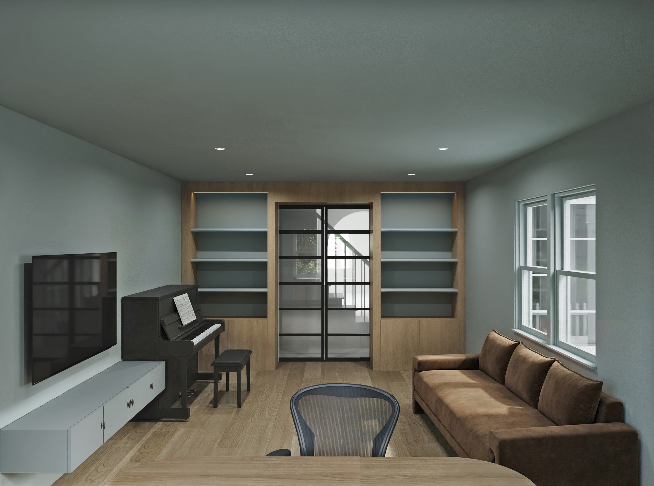 bauhaus interior shot luxurious modern living room with a minimalist design featuring a sleek black digital piano and matching bench the walls are a calming shade of soft grey blue complementing the light wood tones of the floor and bookshelves the sofa is upholstered in a rich warm brown fabric adding coziness large elegant windows with white frames allow natural daylight to flood the room casting gentle shadows the tv is sleek and modern resting on a light grey console the atmosphere is serene sophisticated and inviting accentuated by recessed ceiling lights architecture