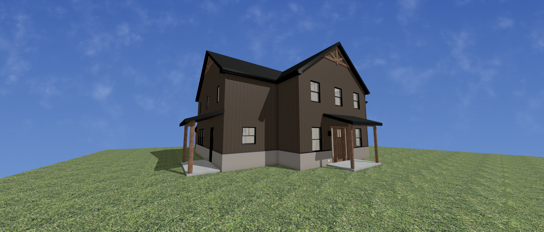 a modern two story farmhouse with dark vertical board and batten siding black metal roofing exposed wooden trusses under the front gable and natural timber posts supporting the entry porch retain the exact structure window placements rooflines concrete foundation and overall geometry from the reference image place the home on a gentle grassy slope but add a clean smooth concrete front surround the property with a lush dense forest backdrop of tall mixed trees position the sun behind the trees so warm natural sunlight streams through the branches creating soft rays and dappled highlights on the house produce ultra realistic lighting crisp shadows detailed textures on wood siding and metal roof and a bright clear blue sky with light clouds hyper realistic rendering 8k resolution architectural visualization quality