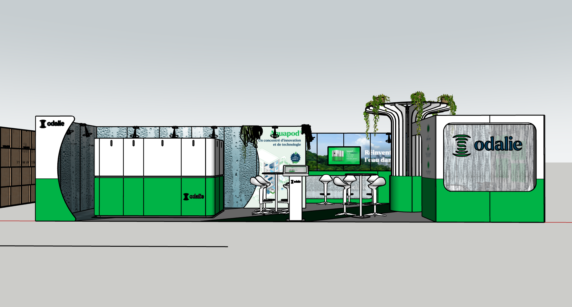 art deco interior shot ultra photorealistic high end rendering of a contemporary exhibition stand located inside a large professional trade show exhibition hall architecture