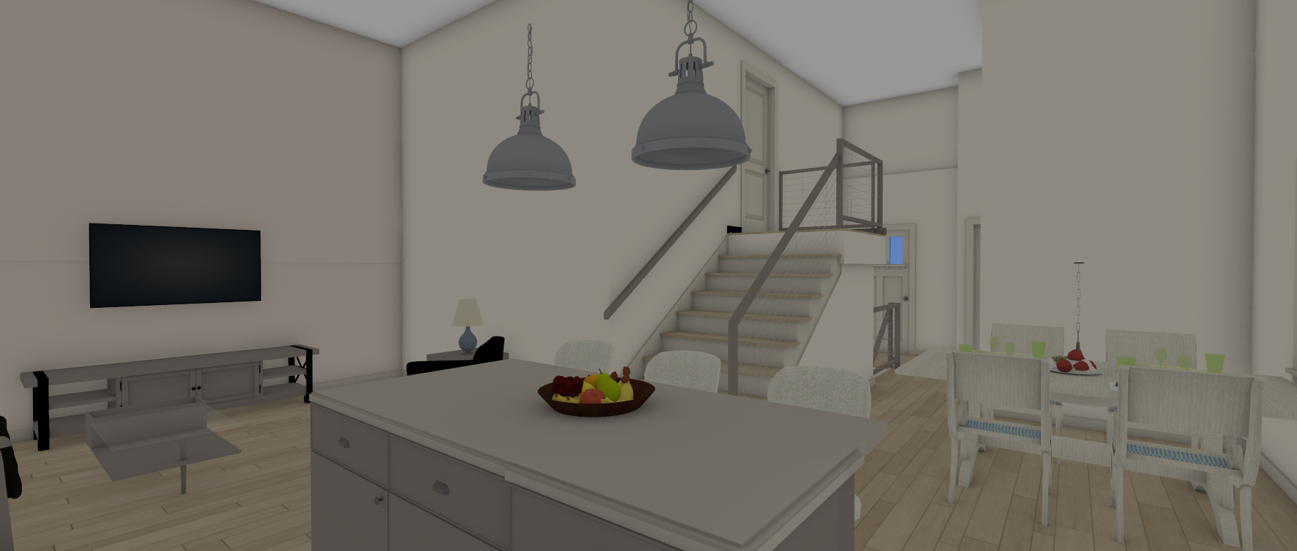 create a high resolution photorealistic interior rendering based on the reference image mnt data a32690ce 3304 443e bcf0 3ff4123f16b1 png maintain all architectural and interior features exactly as shown the kitchen island and cabinetry pendant lights fruit bowl flooring living room furniture tv and console staircase with cable railing dining table and chairs wall colors and overall room proportions enhance all materials to realistic textures including wood floors painted walls metal fixtures and fabric upholstery casting gentle natural reflections and warm ambient light into the interior keep the scene crisp sharp and fully photorealistic