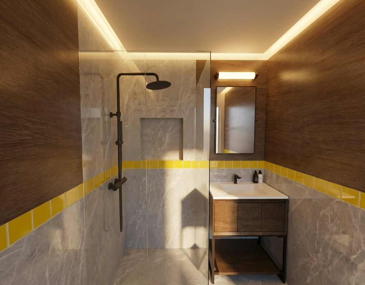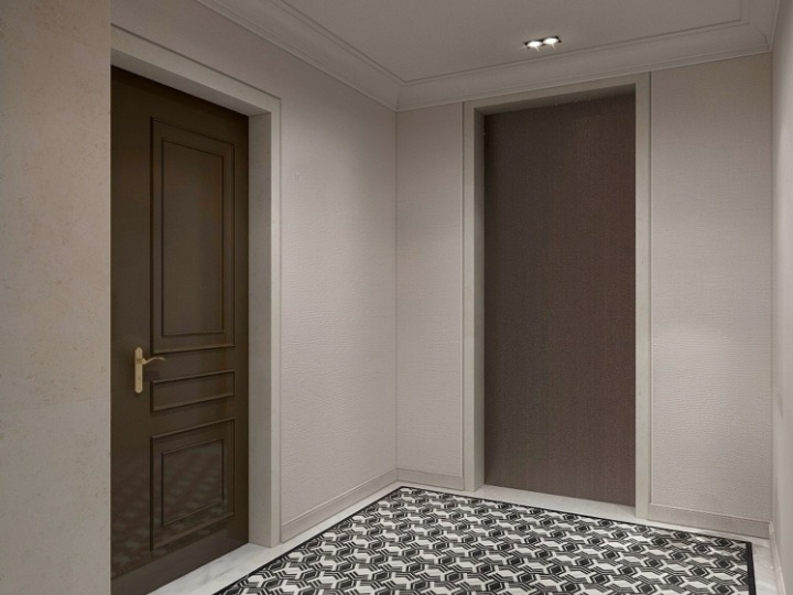 exterior shot interior shot photorealistic render of a entrance lift lobby design colours and floor pattern as is just place furniture inside rendering