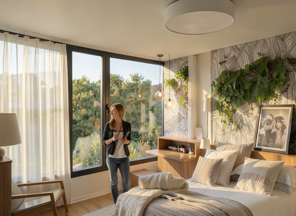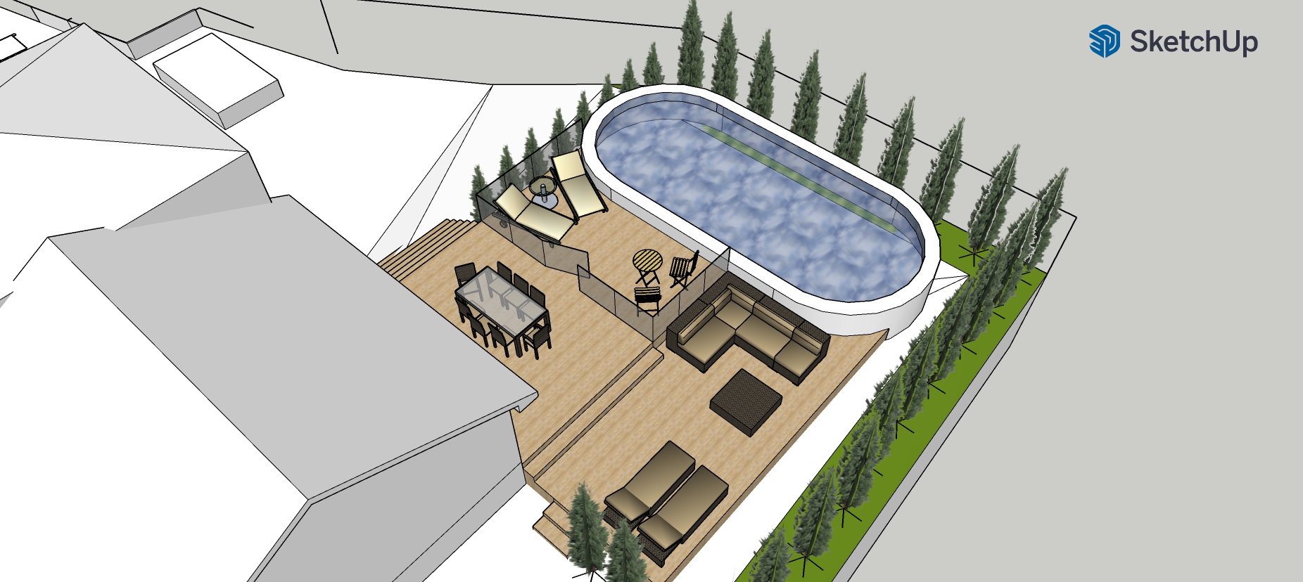 create a realistic high quality rendering of a residential backyard in a contemporary style the scene includes a modern above ground swimming pool as the central feature at the back of the pool include a full height opaque wooden fence to provide privacy from neighboring properties the fence should have a clean modern design with vertical wood slats in a natural or warm tone on the left side of the pool design a cozy outdoor living area located at the base of an exterior staircase this space should include a built in or freestanding fire pit surrounded by contemporary outdoor lounge furniture low profile chairs or sectional seating use materials such as metal wood and neutral toned cushions incorporate thoughtful landscaping with a minimalist approach clean lines ornamental grasses and subtle lighting integrated into the ground or steps the overall ambiance should feel warm inviting and modern use soft natural lighting late afternoon or golden hour to enhance the atmosphere with realistic shadows and reflections in the water
