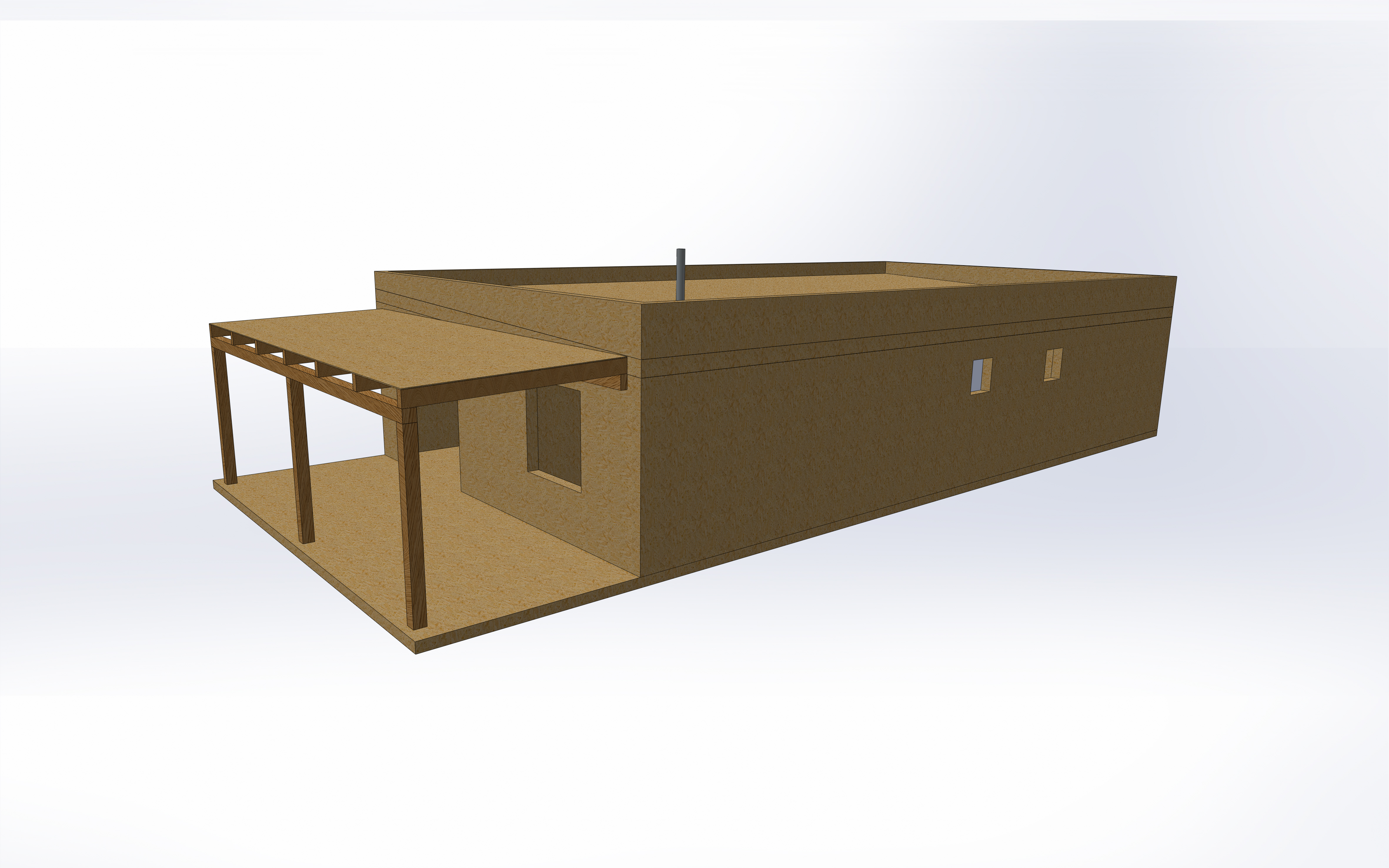 modern perspective shot in the openings add doors and windows biggest opening is glass door white facade with wooden elements add not perfect grass trees and bushes background half clouded sky add a driveway architecture