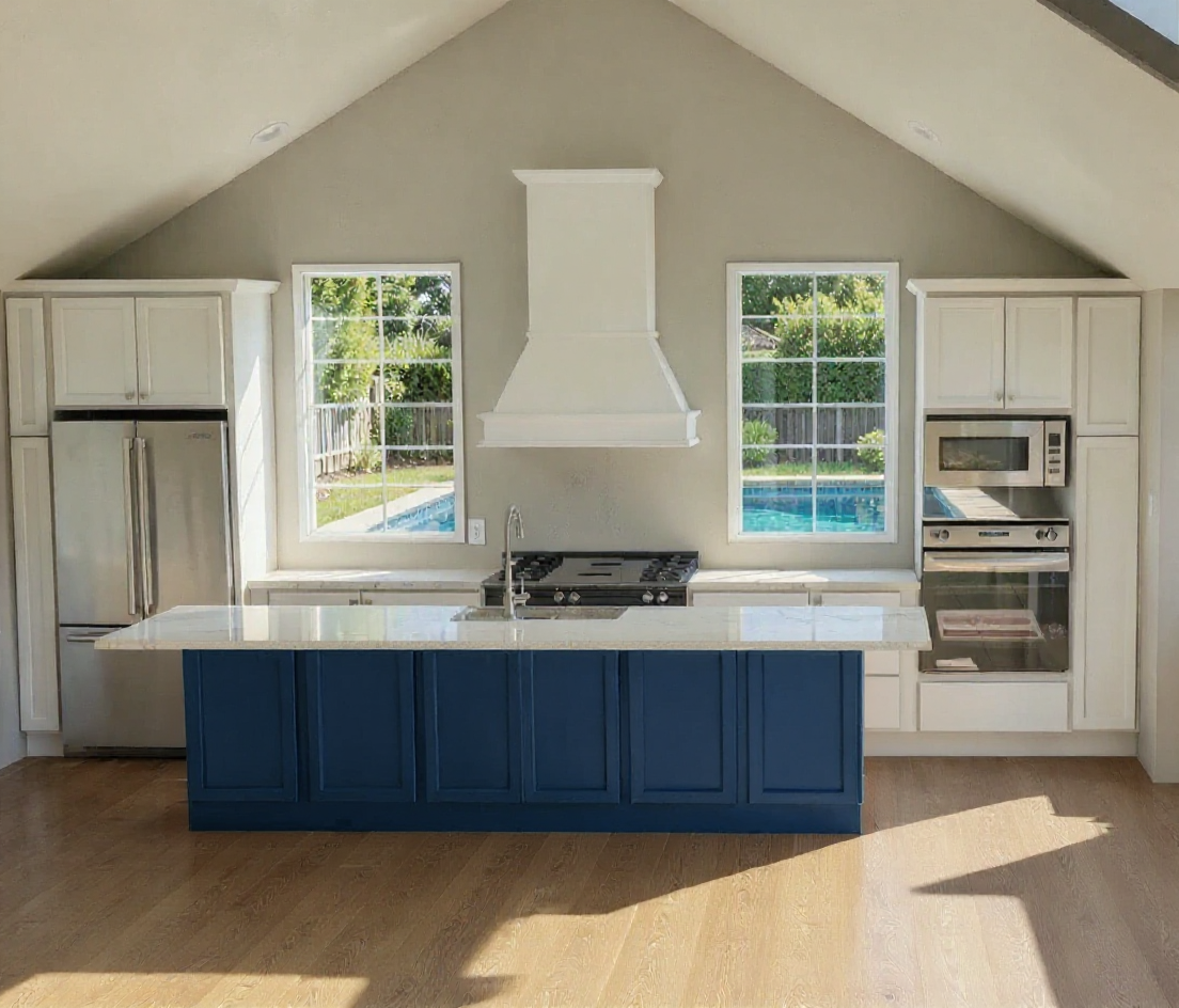 change the blue cabinets to sage green and keep the white cabinets white