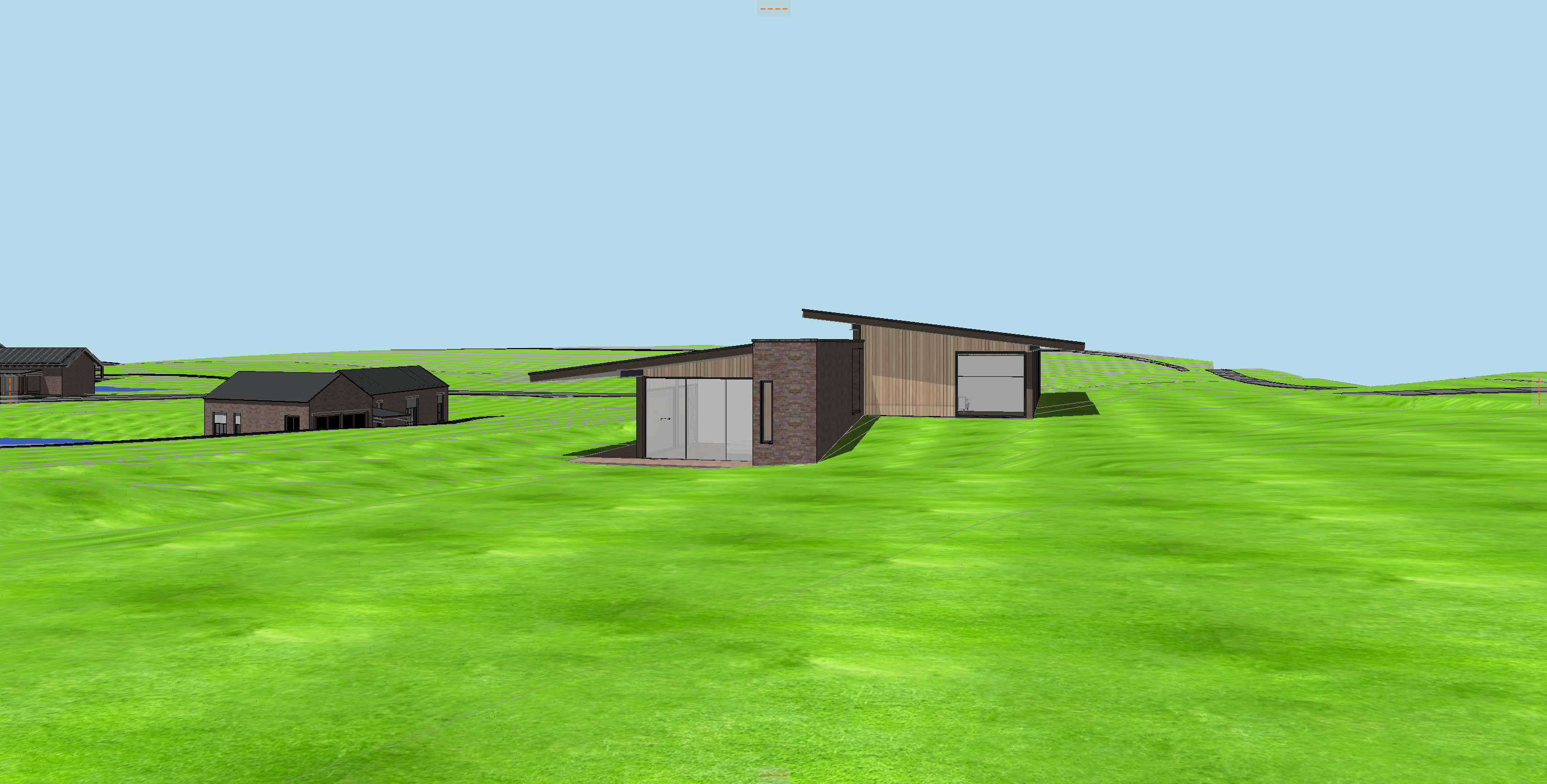 antique brick house with timber columns steel beams glass windows wild lousiana grasses and vibrant wildflowers all the way to house southern yellow pine trees in the background clouds in the sky all glass should be reflective not see through