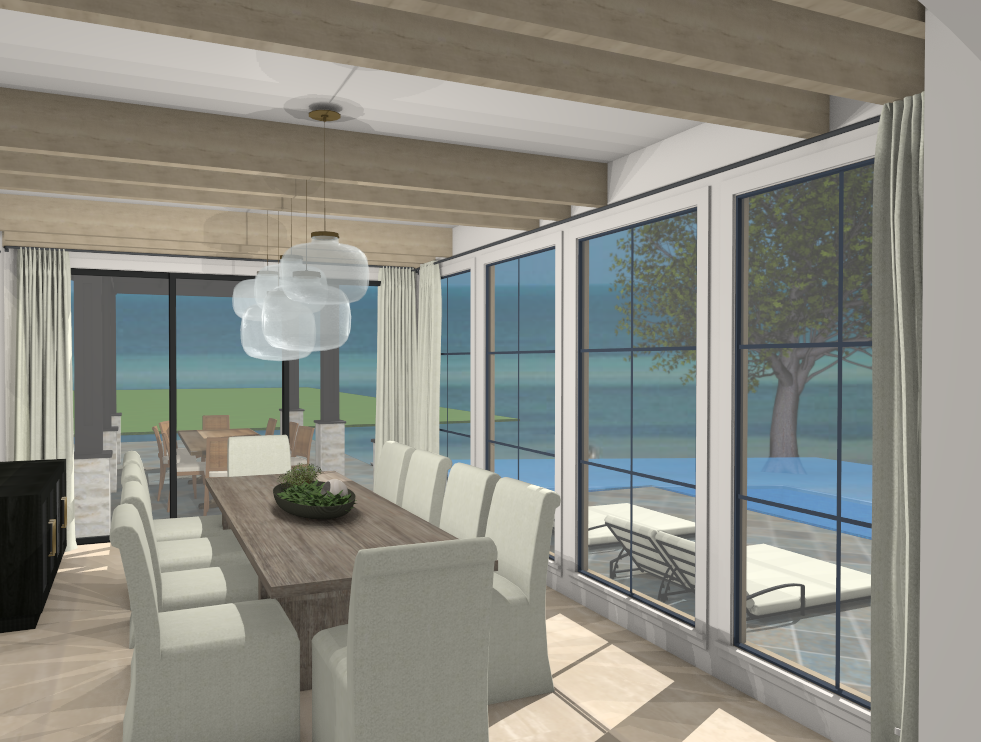 modernist interior shot enhance rendering ocean view background tiled floor cream drapes correct sharp lighting less softness white oak ceiling beams white walls white in between ceiling beams architecture