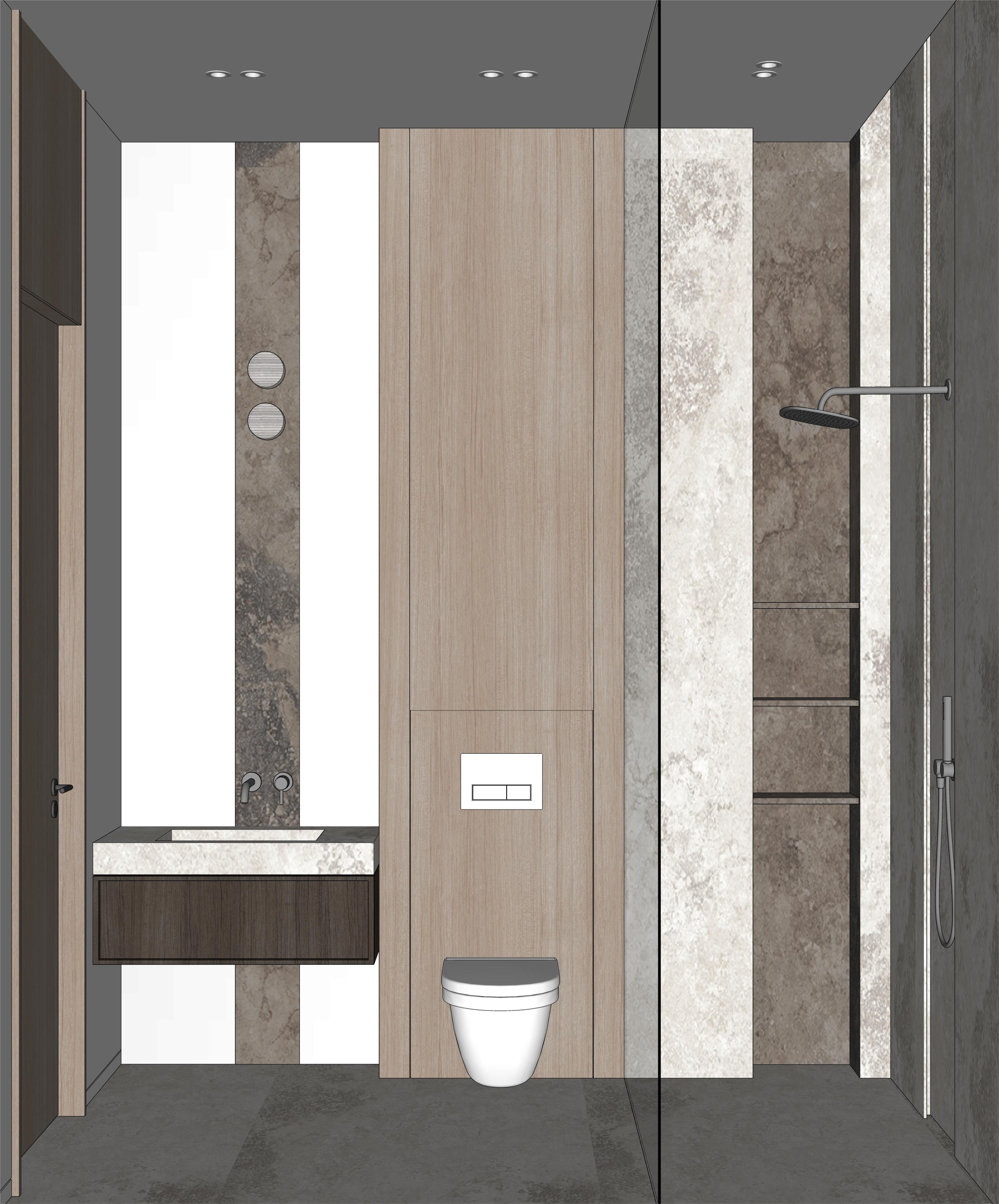create a modern luxurious bathroom scene with a minimalist design the walls feature a mix of light beige and textured stone patterns the ceiling is a sleek matte gray emphasize the wooden panel in soft natural light oak tones contrasting with dark brown accents the vanity is floating with a stone countertop in shades of white and gray the shower is enclosed with clear glass showcasing the stone tiles in various shades of taupe and beige add a suspended contemporary white toilet with clean lines soft ambient lighting creates a serene and sophisticated atmosphere highlighting the elegance and simplicity of the space