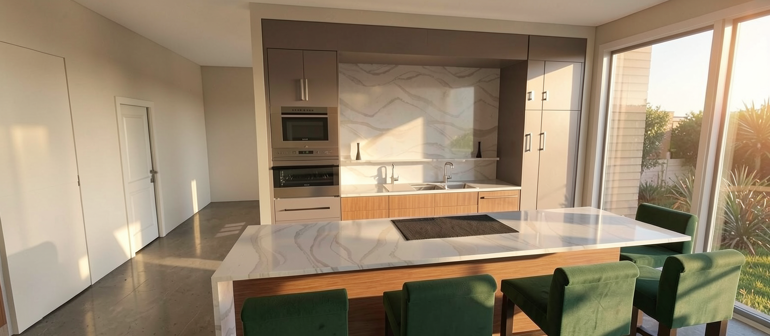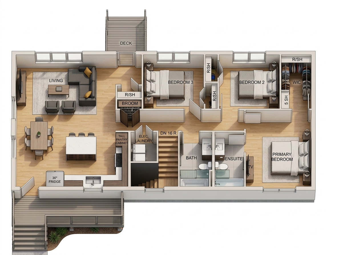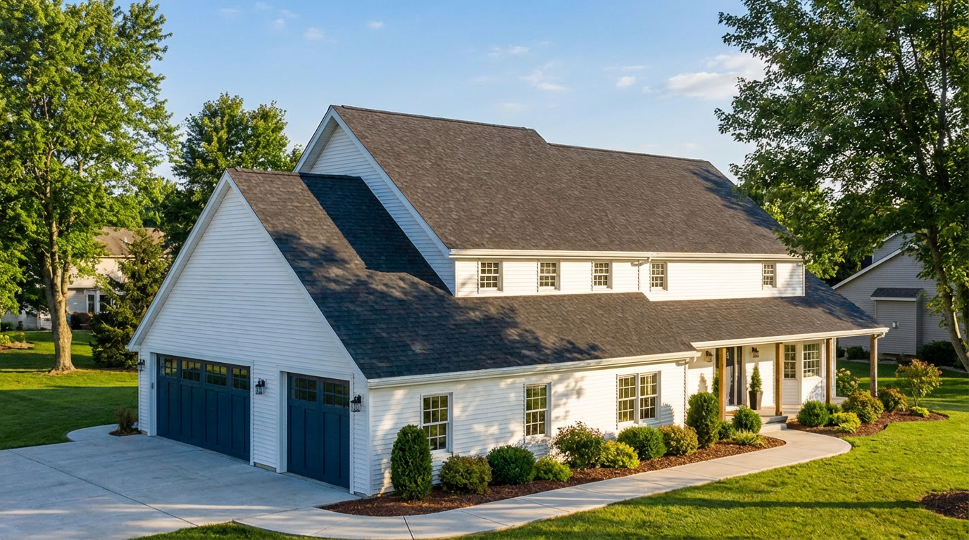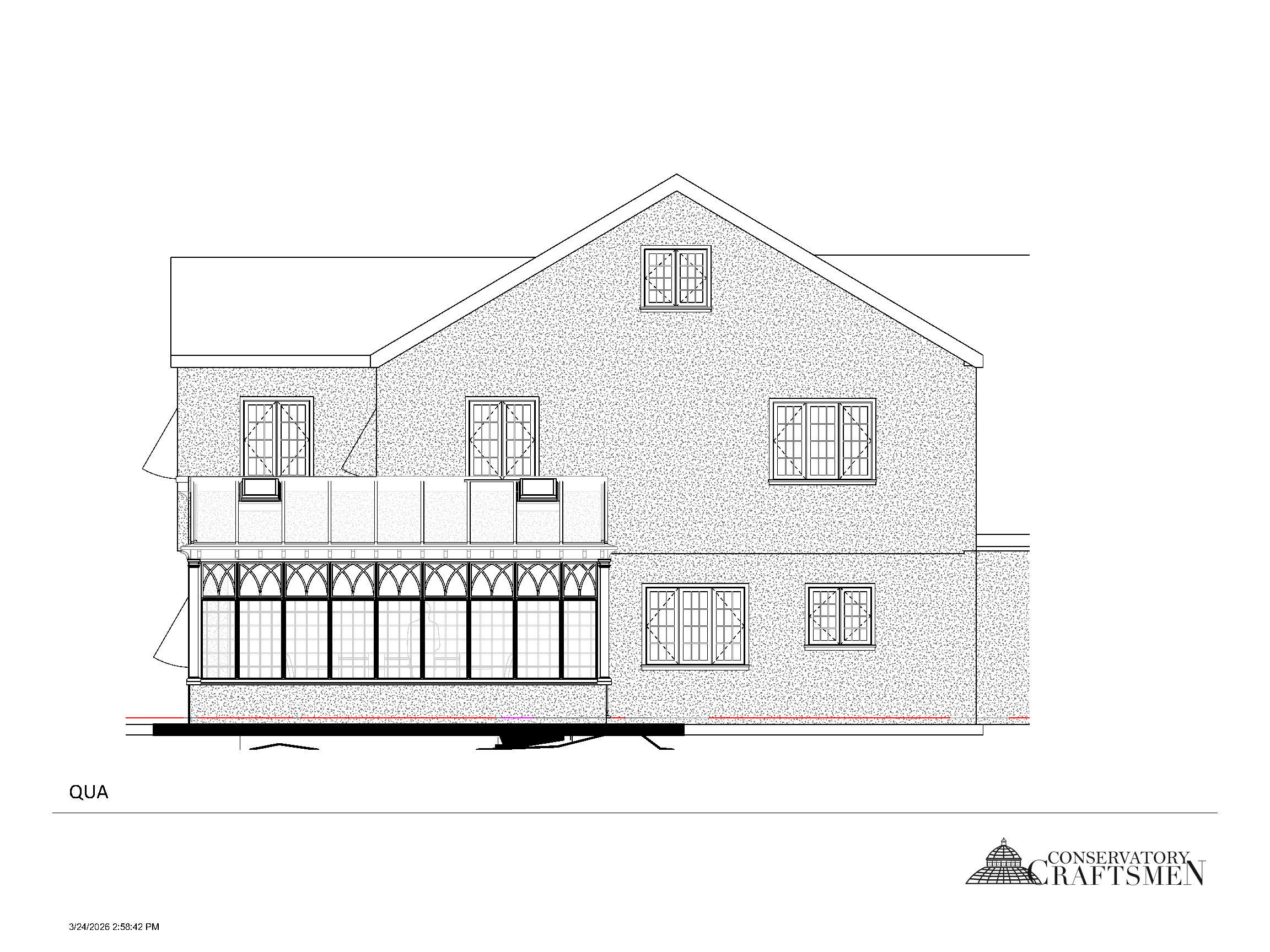 create a beautiful architectural rendering of a large elegant house with a detailed facade use warm beige tones for the walls accented with dark brown trims the windows should have a reflective glass effect capturing subtle hints of the surrounding landscape add muntin grids in all the windwos for an old world effect for the roof terracotta tile texture to create a sense of durability and style the surrounding landscape should include a paver patio and bbq area and stone steps descending a terraced rock garden gentle sunlight casting soft shadows to create a serene and welcoming atmosphere