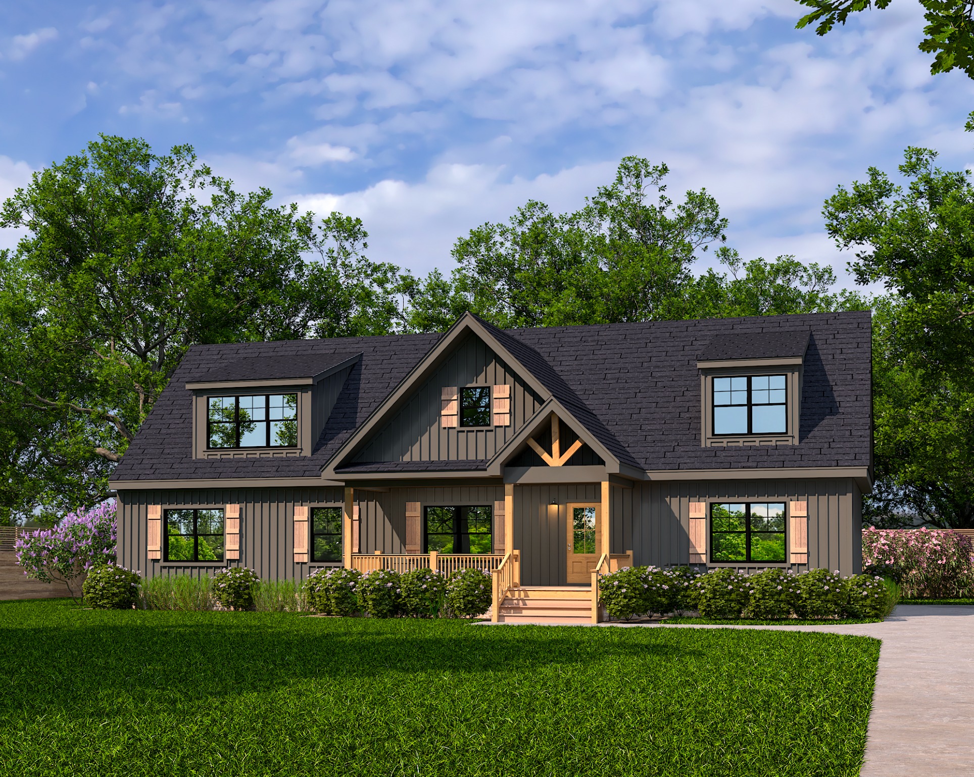 make this look realistic black board batten siding mid tone wood columns shutters porch and front door update porch light to be a modern lantern