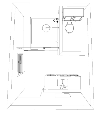 a top down view of a modernist bathroom with light wood grain floor