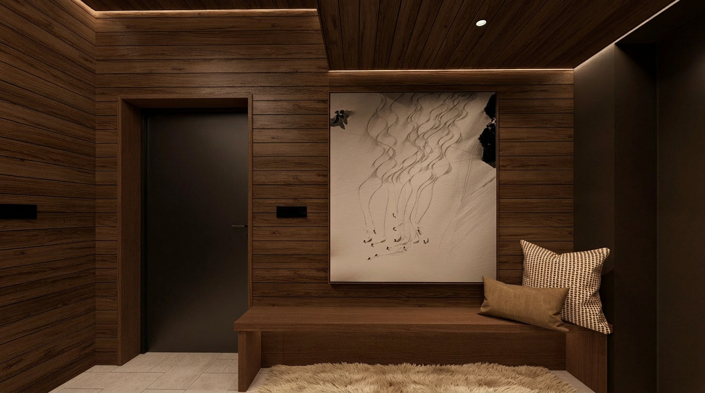 create a realistic photograph of an exterior image in a plot near a small town the roof has dark orange roof tiles in the ground floor the walls of the building are plaster in grey color the first floor is in wood panels the garden has nice and wild gras not so tall keep the geometry of the building in front is olny the street in asphalt