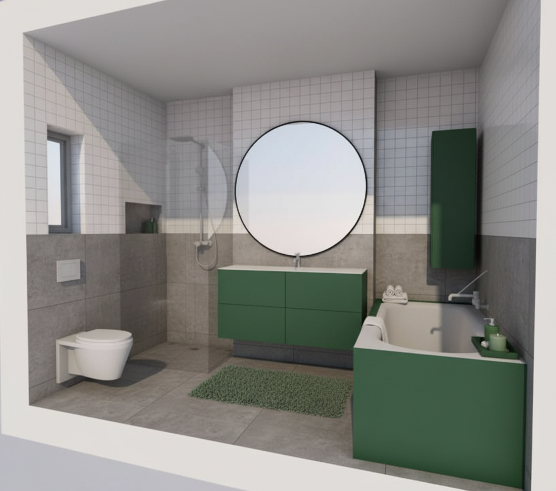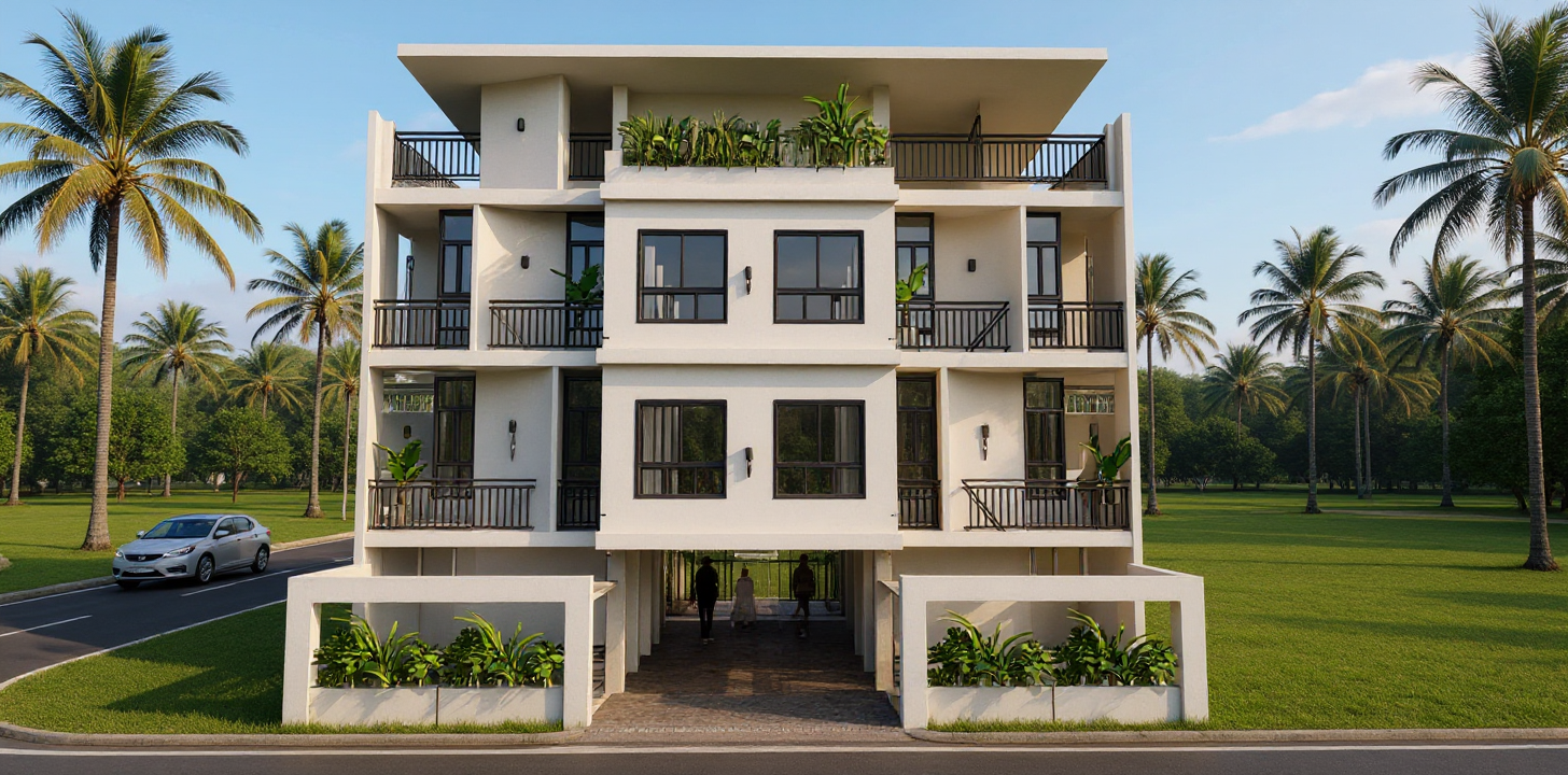symmetrical facade on a landscape with trees surrounding the building add 1 car passing in front add people walking on the sidewalk in front smooth white building front view only