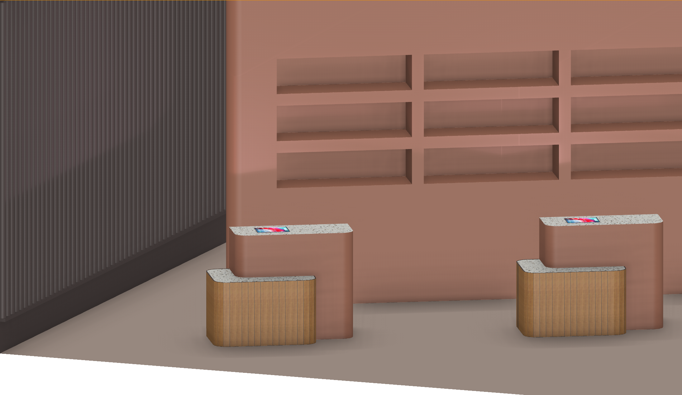 terminals painted teracotta terminals bottom part with cherry wood panels terazzo tops wall painted teracotta