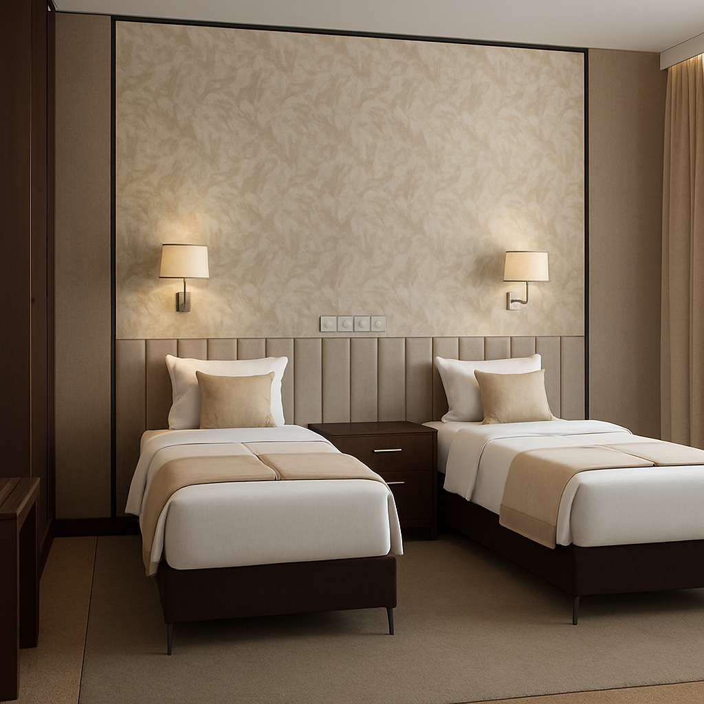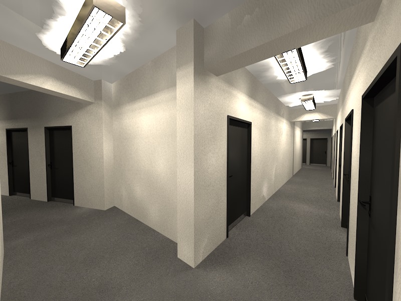 create a beautifully rendered image of a clean modern hallway with a serene and minimalist atmosphere the walls are painted in a vivid white color reflecting warmth and comfort the doors are a sleek matte charcoal providing a sophisticated contrast the floor is epoxy concrete industrial in a smooth light gray color adding a touch of elegance the ceiling lights emit a gentle warm white glow softly illuminating the space with a welcoming ambiance the overall lighting creates delicate shadows and highlights enhancing the depth and tranquility of this quiet peaceful passageway a woman is walking up the corridor with a transport cart