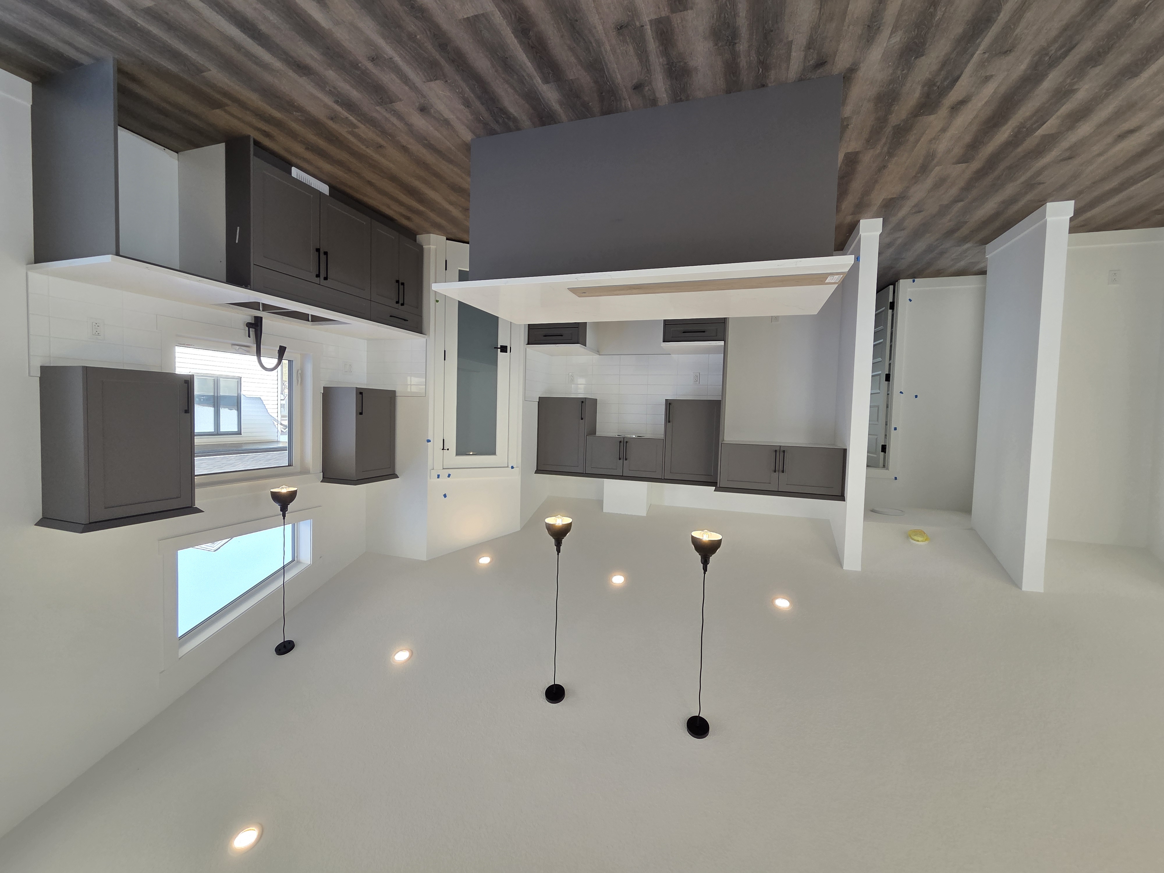 make the interior of this home look complete no furniture fill in the missing spaces in the kitchen where appliances fridge stove dishwasher etc i want the windows not doors to showcase landscaping on the outside of the home keep the dark frosted glass on the pantry door
