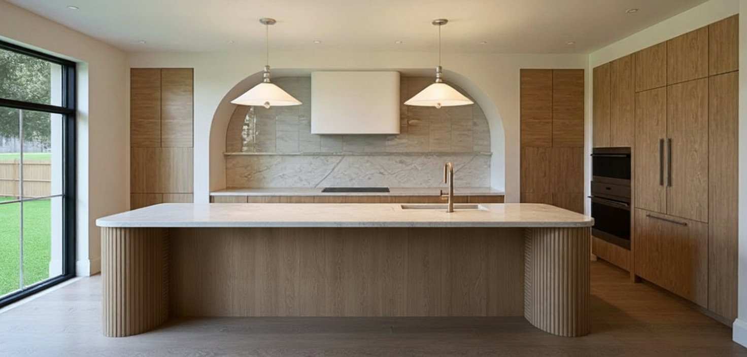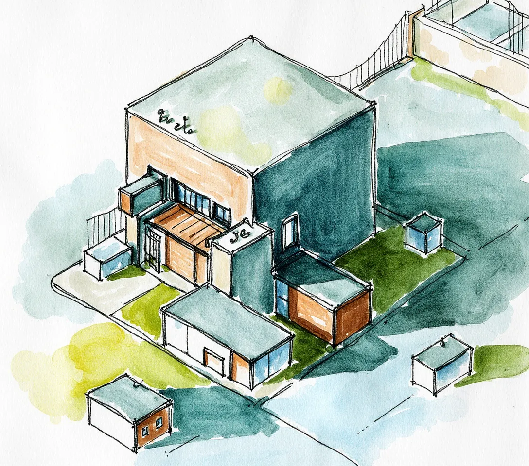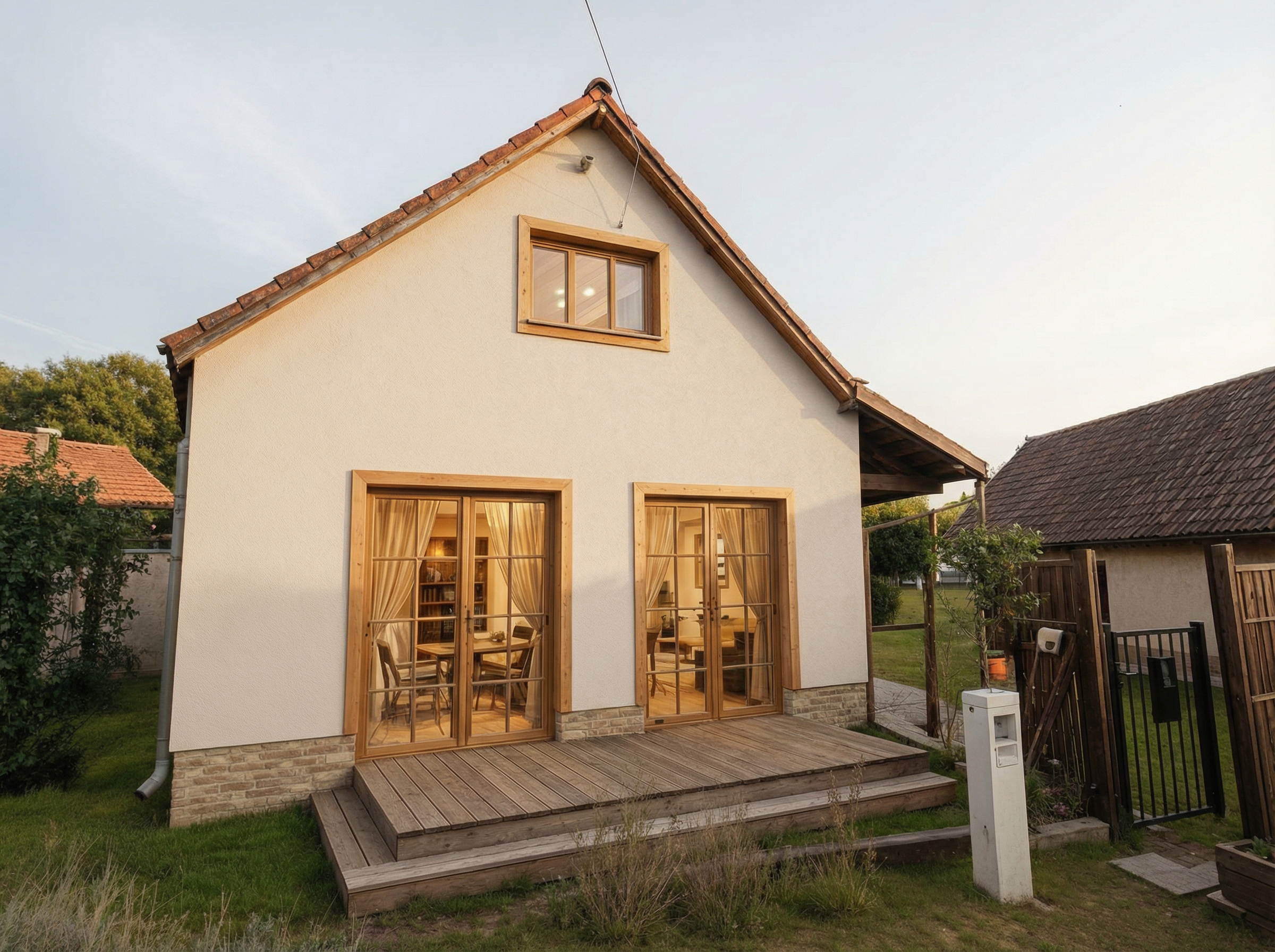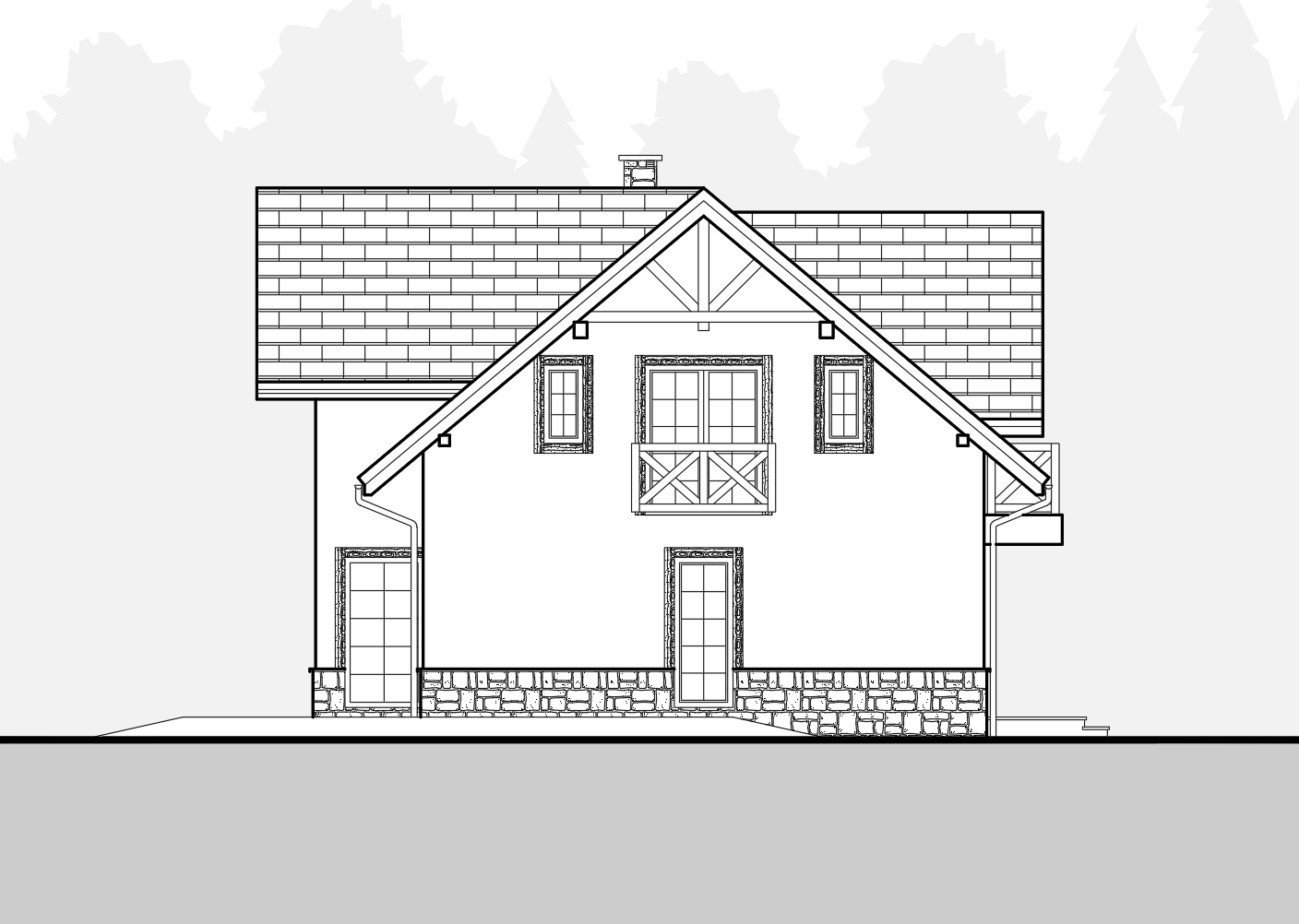 modernist exterior shot stone plinth black shingle roof wooden windows with glazing bars wooden window trim wooden doors wooden garage door beige plaster balcony and terrace with wooden balustrade black gutters and downpipes golden oak color of all wooden elements architecture