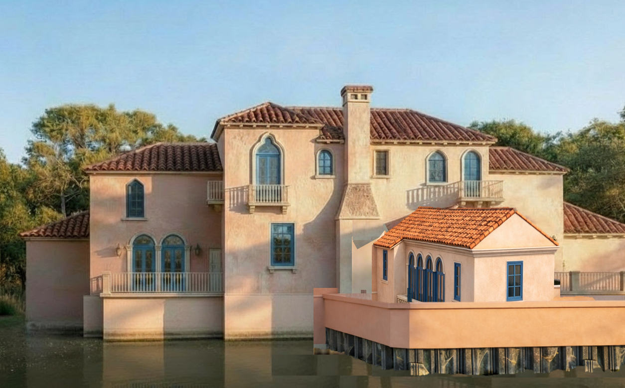 transform this architectural sketch model into a fully realistic waterfront mediterranean residence preserve the exact geometry proportions window placement rooflines chimney location and massing do not alter the structure replace the sketch materials with the following realistic materials and environmental context architecture style mediterranean revival waterfront villa in south florida exterior walls smooth warm peach stucco subtle tonal variation and natural sun weathering matte finish slightly darker band at waterline for realism roof terracotta clay barrel roof tiles natural red orange clay variation visible depth between curved tiles matte finish realistic shadowing between rows windows doors painted wood frames rich mediterranean blue color slight satin finish real glass reflections interior depth visible behind glass balconies railings replace black rails with cast stone balustrades light limestone tone soft weathering and subtle shadow depth mediterranean carved detail look trim arches light cast stone trim around arched windows slight projection for shadow definition chimney same stucco finish as main walls clay tile cap matching roof environment calm waterfront canal in foreground realistic water reflections of building palm trees near left side lush tropical landscaping in background bright sunny south florida daylight clear blue sky lighting high resolution architectural photography natural sunlight from upper left soft shadows warm afternoon light high dynamic range camera eye level perspective slight wide angle lens 24 28mm equivalent professional real estate photography style rendering quality ultra realistic 8k architectural visualization photorealistic textures physically accurate materials sharp focus natural color grading critical constraint do not modify building massing window count roof height or proportions only upgrade materials and environment to photorealistic quality if you tell me which ai engine you re using archsynth midjourney d5 ai stable diffusion etc i can optimize this prompt specifically for that renderer so it behaves more predictably