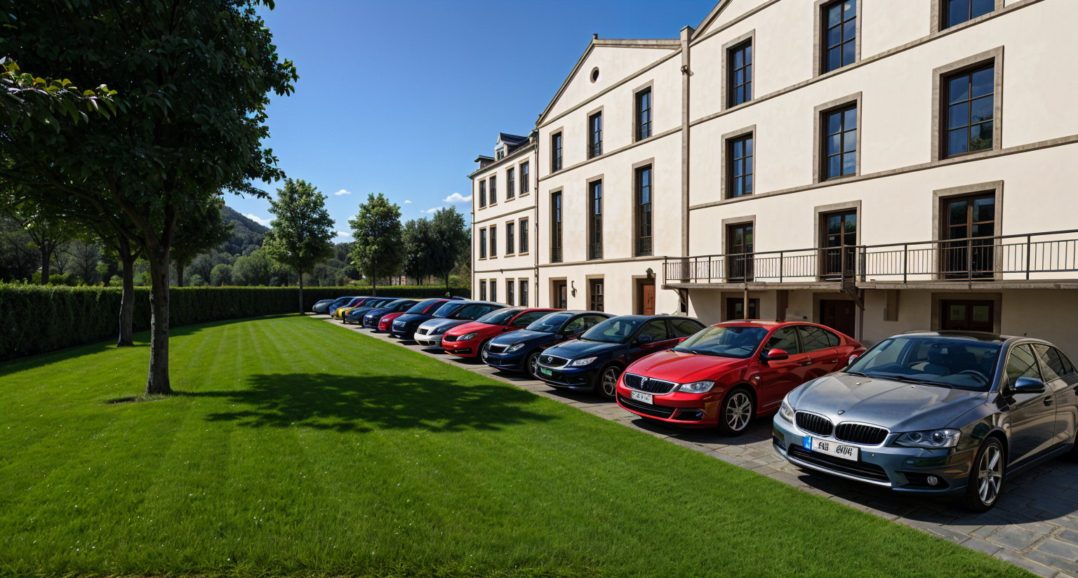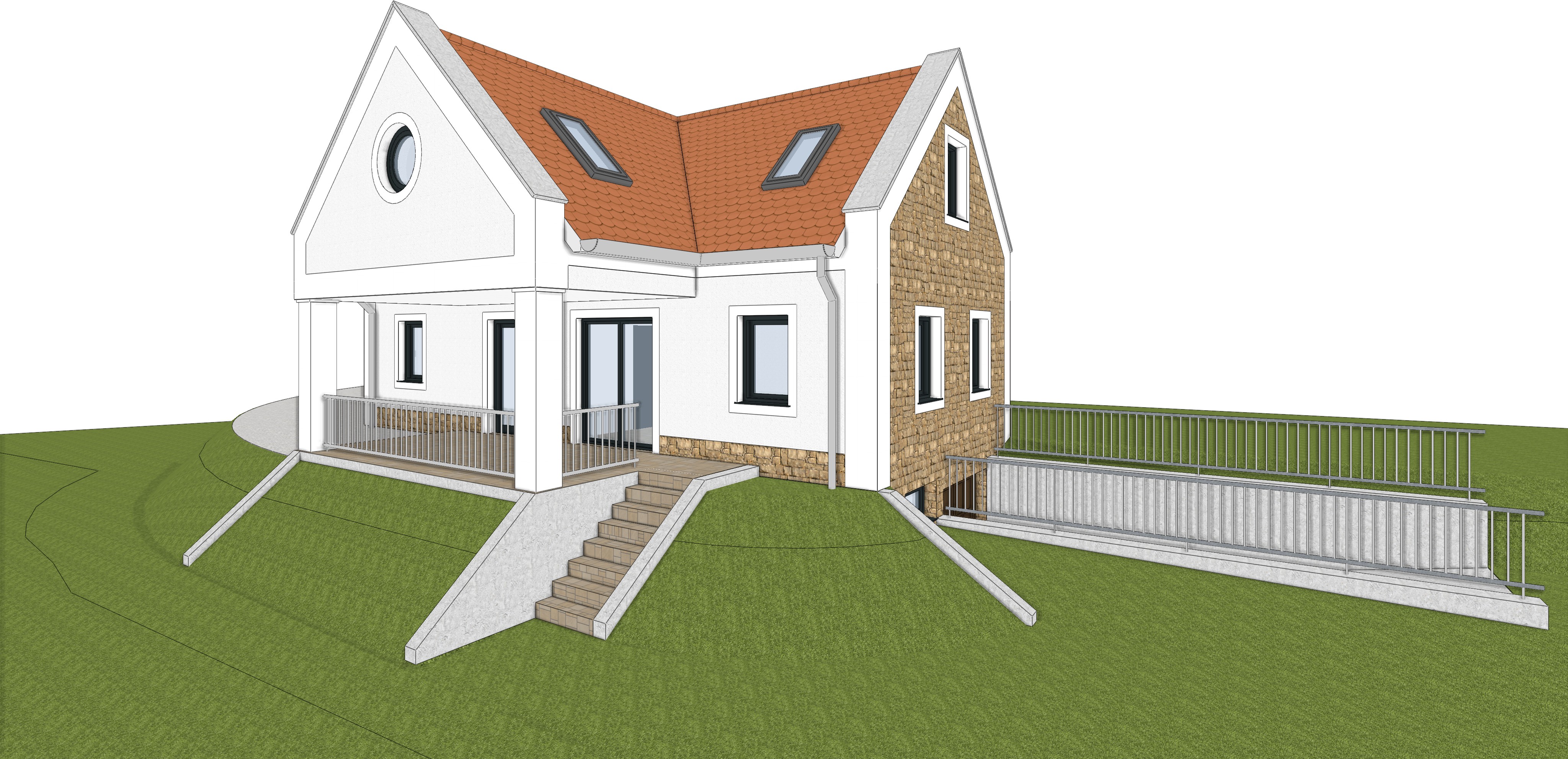 render a charming modern farmhouse with a red terracotta roof and white walls highlight the stone brick accents on the side in warm earth tones the large circular window should reflect a bright sky while the other windows display a gentle light blue tint the porch and stairs are in light gray concrete with wooden railings surround the house with lush green grass evoking a peaceful and inviting atmosphere capture the essence of a sunny day casting soft realistic shadows on the structure