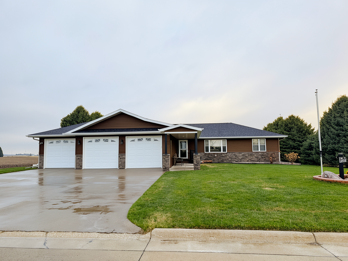 change siding color to greige brown and keep garage doors and windows white and keep posts black