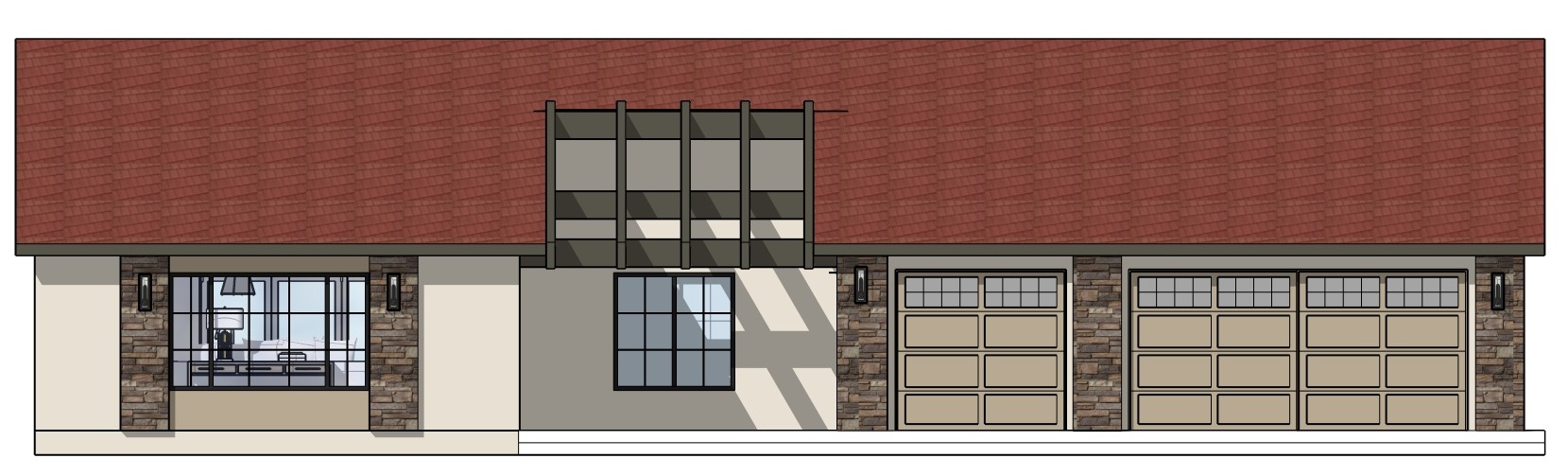 render the garage door color per the original drawing the garage door color is also the stucco below and above the large window on the left the area behind the open beams is stucco the same iight beige color as the base stucco on the house