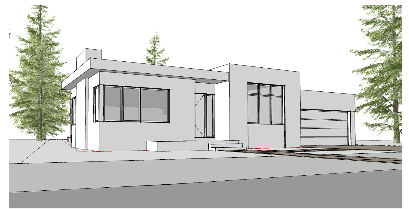 can you render this image without changing any design elements and line work to be more colorful and photorealistic using white stucco and dark roof edges lush landscape and twilight with lights in the windows place the building into suburban location in palo alto