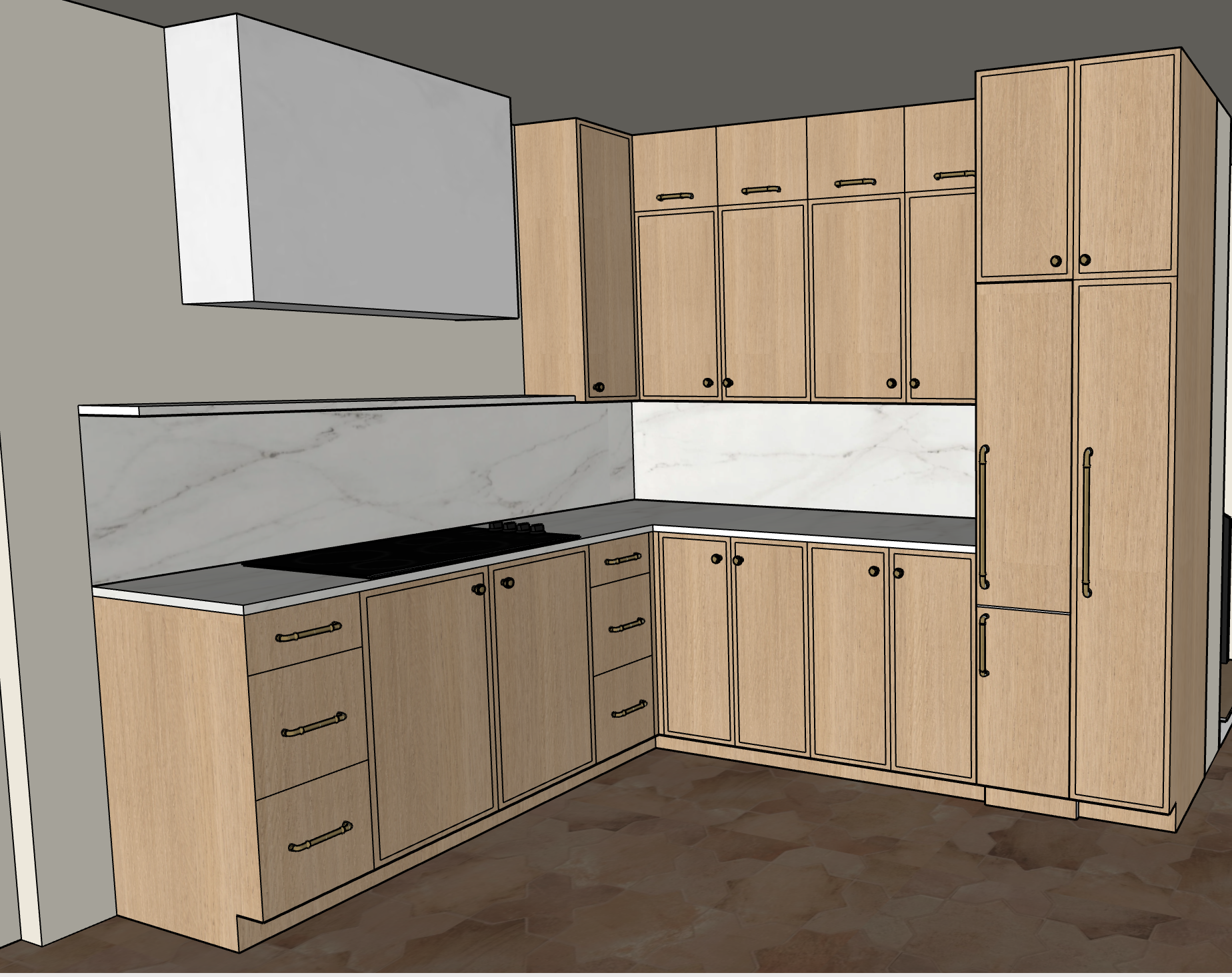 a modern kitchen interior with a warm inviting atmosphere wooden cabinets in a light oak finish gold handles for a touch of elegance a smooth white marble countertop with subtle gray veining the farmhouse sink is white ceramic complementing the gold faucet the black framed windows capturing soft natural light the walls and ceiling are painted light creamy white the floor is covered in rich terracotta tiles lending warmth and texture the ambient lighting is soft and cozy accentuating the kitchen s sophisticated yet comfortable feel