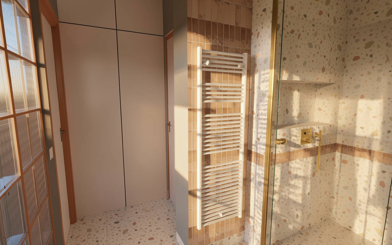 rustic modern boho bathroom beige tile floors and vertical slat wood looking tile on shower walls and tub surround